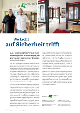 150 BEST OF Portrait xxx Wo Licht auf Sicherheit trifftIn der Fenster-Center AG z%u00e4hlt nicht nur das perfekte Fenster %u2013 sondern das gute Gef%u00fchl, die richtige Entscheidung getroffen zu haben. Mit ehrlicher Beratung, handwerklicher Pr%u00e4zision und einem feinen Gesp%u00fcr f%u00fcr individuelle Bed%u00fcrfnisse entstehen L%u00f6sungen, die Sicherheit und Licht ins Leben bringen.Glas, Leim, Holzrahmen und bestenfalls ein bisschen Alu: So stellen sich Laien ein Fenster vor, um dann zu staunen, wenn ihnen Dieter Hunziker einen Querschnitt von einem seiner Spitzenprodukte zeigt: ein mehrfachverglastes Meisterwerk von Internorm. %u00abWir arbeiten ausschliesslich mit den Produkten dieses erfahrenen Herstellers.%u00bb Es ist stylish und %u00aberf%u00fcllt allerh%u00f6chste Anspr%u00fcche an W%u00e4rmed%u00e4mmung, Schallschutz und Sicherheit%u00bb, erz%u00e4hlt der Gr%u00fcnder und Gesch%u00e4ftsf%u00fchrer der Fenster-Center AG in Reinach begeistert. Vor 25 Jahren hat der gelernte Schreiner die Firma gegr%u00fcndet und in dieser Zeit eine atemberaubende technologische Entwicklung erlebt. Doch etwas ist genau gleich wie am Anfang %u2026%u00abF%u00fcr uns ist das selbstverst%u00e4ndlich: Der Kunde ist K%u00f6nig. Das bedeutet nicht, dass wir ihm nach dem Mund reden. Ehrlichkeit und kritisches Zur%u00fcckfragen sind zentral.%u00bb So gilt es h%u00e4ufi g Designanspr%u00fcche mit praktischen Eigenschaften in eine Balance zu bringen. %u00abNat%u00fcrlich ist Vollverglasung mit m%u00f6glichst fi ligranem Rahmen sch%u00f6n. Doch das wirkt sich auf W%u00e4rme- und Schalld%u00e4mmung, Stabilit%u00e4t und Sicherheit aus. Zudem ist die Pflege aufwendiger. All das gilt es zu ber%u00fccksichtigen und zu kl%u00e4ren.%u00bb Diese umfassende und nachhaltige Beratung und Umsetzung f%u00fchrt zu einer hohen Kundenzufriedenheit. Ein zus%u00e4tzlicher Faktor ist Flexibilit%u00e4t: %u00abWir sind auf Umbauten und Renovationen spezialisiert, da ist jeder Auftrag anders, gilt es immer wieder sich auf Neues einzustellen. Was nat%u00fcrlich auch spannend ist.%u00bb Ein Ortstermin ist deshalb zwingend. Diese Vielfalt gef%u00e4llt auch Nico Hunziker, Sohn und stv. Gesch%u00e4ftsf%u00fchrer in der Fenster-Center AG. %u00abEs geht nichts %u00fcber den Kundenbesuch%u00bb, sagt Nico. %u00abMan sieht, was technisch m%u00f6glich ist, wo Herausforderungen liegen %u2013 etwa bei Storen oder Leibungen.%u00bb Jeder Auftrag wird individuell geplant, jeder Rahmen massgeschneidert. %u00abWir passen diesen individuell bis an die Leibung an. Standardl%u00f6sungen gibt es bei uns nicht.%u00bb Was Vater und Sohn bei all dem enorm sch%u00e4tzen, ist das Engagement der Mitarbeitenden: %u00abSie arbeiten als ob es ihr eigener Betrieb w%u00e4re. Wir ziehen alle an einem Strick. Das fi nden wir super%u00bb, so Dieter Hunziker. Neben Fenstern bietet der Reinacher Familienbetrieb auch T%u00fcren an %u2013 ebenfalls von Internorm. Steigender Beliebtheit erfreuen sich auch Insektenschutz-Elemente. Da ist es f%u00fcr Kundinnen und Kunden einfach wichtig zu wissen, dass sie sich rechtzeitig darum k%u00fcmmern. Denn die Auftragsb%u00fccher der Hunzikers f%u00fcllen sich schnell. Und trotzdem: %u00abwir tun unser Bestes auch kurzfristige Auftr%u00e4ge umzusetzen%u00bb, betont Nico Hunziker. Denn wie bereits gesagt: %u00abDer Kunde ist K%u00f6nig. Jetzt und auch in Zukunft.%u00bb Adresse: Fenster-Center AG ReinachAarauerstrasse 29, 5734 ReinachTelefon: +41 62 772 42 22E-Mail: briefkasten@fenster-center.chWeb: www.fenster-center.chIn K%u00fcrze: Die Fenster-Center AG Reinach ist Servicepartner im Bereich Fenster, Fensterl%u00e4den, Haust%u00fcren, Glaserarbeiten und Insektenschutz und das zum besten Preis-LeistungsVerh%u00e4ltnis. BEST OF Region Aarau-Suhrental-Wynental