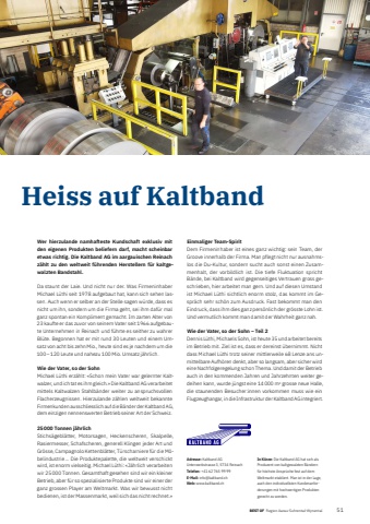 BEST OF Portrait xxx 51Heiss auf Kaltband Adresse: Kaltband AGUnterwerkstrasse 3, 5734 ReinachTelefon: +41 62 765 99 99E-Mail: info@kaltband.chWeb: www.kaltband.chIn K%u00fcrze: Die Kaltband AG hat sich als Produzent von kaltgewalzten B%u00e4ndern f%u00fcr h%u00f6chste Anspr%u00fcche fest auf dem Weltmarkt etabliert. Man ist in der Lage, auch den individuellsten Kundenanforderungen mit hochwertigen Produkten gerecht zu werden.Wer hierzulande namhafteste Kundschaft exklusiv mit den eigenen Produkten beliefern darf, macht scheinbar etwas richtig. Die Kaltband AG im aargauischen Reinach z%u00e4hlt zu den weltweit f%u00fchrenden Herstellern f%u00fcr kaltgewalzten Bandstahl.Da staunt der Laie. Und nicht nur der. Was Firmeninhaber Michael L%u00fcthi seit 1978 aufgebaut hat, kann sich sehen lassen. Auch wenn er selber an der Stelle sagen w%u00fcrde, dass es nicht um ihn, sondern um die Firma geht, sei ihm daf%u00fcr mal ganz spontan ein Kompliment gemacht. Im zarten Alter von 23%u00a0kaufte er das zuvor von seinem Vater seit 1966 aufgebaute Unternehmen in Reinach und f%u00fchrte es seither zu wahrer Bl%u00fcte. Begonnen hat er mit rund 30%u00a0Leuten und einem Umsatz von acht bis zehn Mio., heute sind es je nachdem um die 100 %u2013 120 Leute und nahezu 100 Mio. Umsatz j%u00e4hrlich. Wie der Vater, so der SohnMichael L%u00fcthi erz%u00e4hlt: %u00abSchon mein Vater war gelernter Kaltwalzer, und ich tat es ihm gleich.%u00bb Die Kaltband%u00a0AG verarbeitet mittels Kaltwalzen Stahlb%u00e4nder weiter zu anspruchs vollen Flacherzeugnissen. Hierzulande z%u00e4hlen weltweit bekannte Firmenkunden ausschliesslich auf die B%u00e4nder der Kaltband%u00a0AG, dem einzigen nennenswerten Betrieb seiner Art der Schweiz.25 000 Tonnen j%u00e4hrlichStichs%u00e4gebl%u00e4tter, Motorsagen, Heckenscheren, Skalpelle, Rasiermesser, Schafscheren, generell Klingen jeder Art und Gr%u00f6sse, Campagnolo Kettenbl%u00e4tter, T%u00fcrscharniere f%u00fcr die M%u00f6belindustrie %u2026 Die Produktepalette, die weltweit verschickt wird, ist enorm vielseitig. Michael L%u00fcthi: %u00abJ%u00e4hrlich verarbeiten wir 25 000 Tonnen. Gesamthaft gesehen sind wir ein kleiner Betrieb, aber f%u00fcr so spezialisierte Produkte sind wir einer der ganz grossen Player am Weltmarkt. Was wir bewusst nicht bedienen, ist der Massenmarkt, weil sich das nicht rechnet.%u00bbEinmaliger Team-SpiritDem Firmeninhaber ist eines ganz wichtig: sein Team, der Groove innerhalb der Firma. Man pflegt nicht nur ausnahmslos die Du-Kultur, sondern sucht auch sonst einen Zusammenhalt, der vorbildlich ist. Die tiefe Fluktuation spricht B%u00e4nde, bei Kaltband wird gegenseitiges Vertrauen gross geschrieben, hier arbeitet man gern. Und auf diesen Umstand ist Michael L%u00fcthi sichtlich enorm stolz, das kommt im Gespr%u00e4ch sehr sch%u00f6n zum Ausdruck. Fast bekommt man den Eindruck, dass ihm dies ganz pers%u00f6nlich der gr%u00f6sste Lohn ist. Und vermutlich kommt man damit der Wahrheit ganz nah.Wie der Vater, so der Sohn %u2013 Teil 2Dennis L%u00fcthi, Michaels Sohn, ist heute 35 und arbeitet bereits im Betrieb mit. Ziel ist es, dass er dereinst %u00fcbernimmt. Nicht dass Michael L%u00fcthi trotz seiner mittlerweile 68 Lenze ans unmittelbare Aufh%u00f6ren denkt, aber so langsam, aber sicher wird eine Nachfolgeregelung schon Thema. Und damit der Betrieb auch in den kommenden Jahren und Jahrzehnten weiter gedeihen kann, wurde j%u00fcngst eine 14 000 m2 grosse neue Halle, die staunenden Besucher:innen vorkommen muss wie ein Flugzeughangar, in die Infrastruktur der Kaltband AG integriert.BEST OF Region Aarau-Suhrental-Wynental