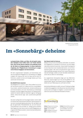 521 BEST OF Portrait xxxIm %u00abSonneb%u00e4rg%u00bb deheimeAdresse: Pflegezentrum SonnenbergNeudorfstrasse 55, 5734 ReinachTelefon: +41 62 765 08 08E-Mail: info@pflege-sonnenberg.chWeb: www.pflege-sonnenberg.chIn K%u00fcrze: W%u00fcrdevolle Betreuung sowie eine Umgebung, in der sich Mensch und Tier wohlf%u00fchlen, zeichnen das Pflegezentrum Sonnenberg aus.Lachende Kinder, M%u00fctter und V%u00e4ter, die sich gleich neben dem Spielplatz einen Kaffee holen. Vor Freude iahende Esel, wenn sie den Abwart erblicken. Ein wedelnder Hund, der die G%u00e4ste am Eingang begr%u00fcsst. In dieser idyllischen Umgebung des Pflegezentrums Sonnenberg im aargauischen Reinach begegnen sich Generationen.Mit dem angrenzenden Spielplatz und Streichelzoo wird das privat gef%u00fchrte Pflegezentrum Sonnenberg zum Begegnungsort von Jung und Alt. Auch im Haus sind es nicht nur Menschen, sondern mit den vier herzigen Katzen auch Tiere, welche den Ort bereichern.Den Bed%u00fcrfnissen anpassenDas Pflegezentrum wurde im Jahr 1966 er%u00f6ffnet und die alten Strukturen wurden vor 3 Jahren durch ein neues Bettenhaus ersetzt, welches Einzelzimmer, Gemeinschaftsr%u00e4ume, eine Demenzstation und einen Abschiedsraum beherbergt. Erweitert wird das Angebot demn%u00e4chst mit G%u00e4stezimmern, welche f%u00fcr externe Gaste an sch%u00f6nster Lage zur Verf%u00fcgung stehen. Diese k%u00f6nnen tage- oder wochenweise gemietet werden. Das Heim verf%u00fcgt %u00fcber eine hauseigene Spitex. Zudem stellt ein h%u00f6herer Personalschl%u00fcssel speziell f%u00fcr Demenzpatient:innen eine individuelle Betreuung sicher. Mit viel Gef%u00fchl w%u00e4gen die geschulten Mitarbeitenden ab, wie viel Freiraum w%u00fcnschenswert und zumutbar ist. %u00abAufgrund der erh%u00f6hten Nachfrage wird unser Haus zurzeit um zw%u00f6lf Pflegebetten auf insgesamt 83 Pl%u00e4tze erweitert%u00bb, betont die Gesch%u00e4ftsleiterin, Miriam Lo Conte. Der Mensch steht im ZentrumBeliebt sind auch die verschiedenen Aktivit%u00e4ten. So arbeitet das Pflegezentrum sporadisch mit Schulen und dem Regionalen Besuchsdienst zusammen. Dieser bietet Freiwillige auf, die den Bewohner:innen Gesellschaft leisten und mit ihnen spazieren gehen. %u00abWir sind in der gl%u00fccklichen Lage, dass wir viele Fachkr%u00e4fte einsetzen k%u00f6nnen und unsere Fluktuationsrate sehr tief liegt%u00bb, erkl%u00e4rt Lo Conte. Sie selber arbeitet auch schon seit 21 Jahren im %u00abSonneb%u00e4rg%u00bb. Zur angenehmen Atmosph%u00e4re tr%u00e4gt auch das %u00f6ffentliche Bistro bei, welches t%u00e4glich von 7 bis 19 Uhr ge%u00f6ffnet ist. %u00abEs werden jeden Tag vier verschiedene Men%u00fcs angeboten. Neu bieten wir auch %u2039Take away%u203a an%u00bb, so Miriam Lo Conte.Wie die Gesch%u00e4ftsleiterin erz%u00e4hlt, sind auch Trekking-Ausfl%u00fcge ins Naherholungsgebiet mit den Bewohnern des Streichelzoos (Lamas, Esel und Ziegen) im Angebot. Lo Conte strahlt: %u00abDas w%u00e4re doch auch eine tolle Geschenkidee f%u00fcr Kinder.%u00bbEingangsbereich des %u00abSonnenberg%u00bb mit angrenzendem KleinzooBEST OF Region Aarau-Suhrental-Wynental