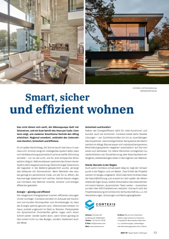 BEST OF Region Baden 5320Das Licht dimmt sich sanft, die W%u00e4rmepumpe l%u00e4uft mit Solarstrom, und ein Gast betritt das Haus per Code: Comtexis zeigt, wie moderne Smarthome-Technik den Alltag erleichtert. Regional verankert, verbindet das Unternehmen Komfort, Sicherheit und Effi zienz.Es ist sp%u00e4ter Nachmittag, die Sonne taucht das Haus in warmes Licht. Drinnen sorgt ein intelligentes System daf%u00fcr, dass sich die Beleuchtung automatisch auf eine sanfte Stimmung einstellt %u2013 nur so viel Licht, wie f%u00fcr eine entspannte Atmosph%u00e4re n%u00f6tig ist. W%u00e4hrenddessen optimiert das Smart-HomeSystem die Energieverwendung: %u00dcbersch%u00fcssiger Solarstrom, der tags%u00fcber in der Batterie gespeichert wurde, versorgt das Geb%u00e4ude mit Sonnenstrom. Beim Betreten des Hauses gen%u00fcgt ein pers%u00f6nlicher Code, um die T%u00fcr zu %u00f6ffnen, die Alarmanlage deaktiviert sich nahtlos. Solche Szenen zeigen, wie Comtexis das Wohnen smarter, sicherer und energieeffi zienter gestaltet.Energie %u2013 g%u00fcnstig und effi zientDie steigenden Energiepreise machen effi ziente L%u00f6sungen immer wichtiger. Comtexis vernetzt im Zuhause der Kundinnen und Kunden Stromquellen und Strombez%u00fcger so, dass die Energie optimal genutzt wird. %u00dcbersch%u00fcsse bleiben im Haus, anstatt ungenutzt ins Netz zu fliessen. Pilotprojekte mit dynamischen Stromtarifen gehen sogar noch einen Schritt weiter: Ger%u00e4te laufen dann, wenn Strom g%u00fcnstig ist. Das schont nicht nur das Budget, sondern stabilisiert auch die Netze.Sicherheit und KomfortNeben der Energieeffi zienz z%u00e4hlt f%u00fcr viele Kundinnen und Kunden auch die Sicherheit. Comtexis bietet daf%u00fcr flexible L%u00f6sungen %u2013 von Zutrittskontrollen bis hin zu zuverl%u00e4ssigen Alarmsystemen. Gleichzeitig erh%u00f6hen die Systeme den Wohnkomfort im Alltag: R%u00e4ume lassen sich individuell temperieren, Beschattungssysteme reagieren automatisch auf Sonnenstand und Jahreszeit. F%u00fcr %u00e4ltere Menschen erm%u00f6glichen Zusatzfunktionen wie Sturzerkennung oder Notrufsysteme ein l%u00e4ngeres, selbstst%u00e4ndiges Leben in den eigenen vier W%u00e4nden.Starke Wurzeln in der RegionAuch wenn Comtexis schweizweit t%u00e4tig ist, liegt der Schwerpunkt in der Region rund um Baden. Zwei Drittel der Projekte werden im Aargau umgesetzt. 2023 %u00fcbernahm Andreas Haas die Gesch%u00e4ftsf%u00fchrung und erwarb ein Jahr sp%u00e4ter die Aktienanteile der Eglin Group. Seither entwickelt er das Unternehmen mit einem kleinen, dynamischen Team weiter %u2013 inzwischen wurden %u00fcber 400 Installationen realisiert. Und auch nach der Projektrealisierung ist Comtexis f%u00fcr die Kundschaft da, u. a. mit Aktualisierungen, Schulungen und Wartungsangeboten. Smart, sicher und effi zient wohnenAdresse: Comtexis AGL%u00e4ndliweg 10, 5400 BadenTelefon: +41 56 221 50 60E-Mail: info@comtexis.comWeb: www.comtexis.comIn K%u00fcrze: Wie sich ein Smarthome anf%u00fchlt, zeigt Comtexis im Showroom in Geroldswil. Besuchende erleben dort u. a. Lichtstimmungen, Audioanlagen oder Beschattungssysteme live in Aktion. Architektur und Generalplanung: DESIGNFUNKTION AGBEST OF Region Baden-Wettingen
