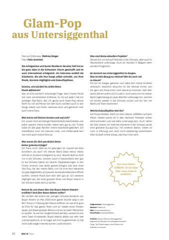 541 BEST OF BEST OF Promi Glam-Popaus UntersiggenthalText und Intervie Mathias StegerFoto: Felix GrotelohDie erfolgreiche und bunte Musikerin Seraina Telli hat es bis ganz oben in die Schweizer Charts geschafft und ist auch international erfolgreich. Im Interview erz%u00e4hlt die K%u00fcnstlerin, die alle ihre Songs selbst schreibt, von ihrer Musik, Karriere-Highlights und Zukunftspl%u00e4nen. Seraina, wie w%u00fcrdest Du selbst Deine Musik defi nieren?Das ist eine ziemlich schwierige Frage, denn meine Musik hat viele verschiedene Einfl%u00fcsse. Es ist auf jeden Fall ein punkiger Pop-Rock, den ich gerne auch Glam-Pop nenne. Nicht nur ich als Person bin sehr bunt, sondern auch in den Songs steckt viel Farbe. Genauso bunt und gemischt sind auch meine Fans.Was hat es mit Deinem bunten Look auf sich?Ich w%u00fcrde mich als farbige Pers%u00f6nlichkeit beschreiben und daher passen meine bunten Haare sehr gut zu mir. Fr%u00fcher habe ich alle paar Wochen meine Haarfarbe ge%u00e4ndert. Ich identifi ziere mich mit meinem Look, und mittlerweile kennen mich auch meine Fans so.Was waren f%u00fcr Dich pers%u00f6nlich Deine bisher gr%u00f6ssten Erfolge?Ich freue mich, dass es mir gelungen ist, sowohl als Solok%u00fcnstlerin als auch mit meiner Band Dead Venus relativ schnell im Ausland erfolgreich zu sein. Aktuell l%u00e4uft es nicht nur in der Schweiz, sondern auch in Deutschland sehr gut. In der Schweiz haben wir bereits Topplatzierungen in den Charts erreicht. Das letzte grosse Ereignis war eine Amerika-Tour, bei der meine Band und ich eine dort bekannte Gruppe begleiteten und jeweils die Konzertabende er%u00f6ffnen durften. Unsere Musik kam dort sehr gut an. Ein weiteres Highlight war, bei einer grossen Show von Bryan Adams in der Schweiz dabei sein zu d%u00fcrfen.Kannst Du uns etwas %u00fcber das Bryan-Adams-Konzert erz%u00e4hlen? Und %u00fcber Bryan Adams selber?Wir durften bei einem der wenigen Schweiz-Konzerte von Bryan Adams im Mai 2024 eine ganze Stunde lang in der BCF Arena in Fribourg den Abend er%u00f6ffnen. Es war eine grosse Ehre f%u00fcr das ganze Team und wir hatten einen Riesenspass, auf dieser grossen B%u00fchne und vor so vielen Menschen zu spielen. Es war ein Vorgeschmack auf das, worauf ich und mein Team hinarbeiten. Bryan Adams selbst war sehr nett und sympathisch, er ist sogar auf mich zugekommen. Er hat mich wohl wegen meines bunten Looks erkannt.Aufgewachsen: UntersiggenthalWohnort: Gisikon LUWeb: www.serainatelli.comSocial Media: serainatellioffi cialIn K%u00fcrze: Seraina Telli aus Untersiggenthal begeistert als Musikerin mit selbstgeschriebenen Songs, Top-Platzierungen in der Schweiz und Auftritten im Ausland.Was sind Deine aktuellen Projekte?Derzeit bin ich viel auf Festivals in der Schweiz, aber auch in Deutschland unterwegs. Auch ein Konzert in Belgien steht auf dem Programm.Du kommst aus Untersiggenthal im Aargau. Was ist Dein Bezug zur Heimat? Bist Du noch viel zu Hause?Ich bin im Aargau geboren und habe dort meine Kindheit verbracht. Nat%u00fcrlich besuche ich die Heimat immer wieder gern und freue mich, nach Hause zu kommen. Seit %u00fcber sechs Jahren wohne ich in Luzern. Auch wenn ich mit meiner Band regelm%u00e4ssig ein paar Wochen unterwegs bin, komme ich immer wieder in die Schweiz zur%u00fcck und bin hier mit Band und Team stationiert. Welche Zukunftspl%u00e4ne hast Du?Seit Ende Oktober 2025 ist mein Album %u00abGREEN%u00bb auf dem Markt. Dieses werde ich in den n%u00e4chsten Monaten umfassend promoten und viel daf%u00fcr unterwegs sein. Auch n%u00e4chstes Jahr planen wir mehrere Konzerte in der Schweiz sowie eine gr%u00f6ssere Europa-Tour mit anderen Bands. Vieles ist noch in Planung und noch nicht vollst%u00e4ndig konkretisiert. Aber es l%u00e4uft immer etwas, das freut mich sehr.Das neue Album %u00abGREEN%u00bb ist ab sofort %u00fcber www.cede.ch erh%u00e4ltlich.