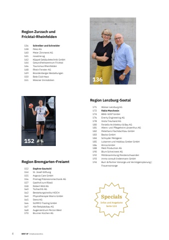 4 BEST OF InhaltsverzeichnisRegion Zurzach und Fricktal-Rheinfelden136 Schreiber und Schneider138 Peko AG140 Meier Zimmerei AG141 novaline ag142 K%u00f6ppel Geb%u00e4udetechnik GmbH144 Gesundheitszentrum Fricktal146 Tourismus Rheinfelden148 Rhein Fenster AG149 Brandenberger Bestattungen150 Bata Club Haus151 Wiesner ImmobilienRegion Lenzburg-Seetal171 W%u00fclser Lenzburg AG172 Fabio Marchesin174 BIKE-SOS%u00ae GmbH176 Enerty Engineering AG178 Visita Treuhand AG180 Feniello Architektur & Bau AG181 Alters- und Pflegeheim L%u00e4nzerthus AG182 Peterhans Flachdachbau GmbH183 Baviso GmbH184 Schnyder Metzgerei185 Lukarnen und Holzbau Greber GmbH186 Klinso GmbH188 Meili Production AG190 Blum Schreinerei AG192 Milit%u00e4rsammlung Meisterschwanden193 immo consult lindenmann GmbH194 Burri & Partner Vorsorge und Verm%u00f6gensplanung | Frauenvorsorge136SpecialsInfos und AngeboteSeite 124152Region Bremgarten-Freiamt152 Daphne Gautschi154 St. Josef-Stiftung155 Argovia Care GmbH156 Premag Pr%u00e4zisionsmechanik AG157 Gasthof zum R%u00f6ssli158 Robert Wild AG160 Tschachtli AG162 Bestattungsinstitut KOCH164 Physiotherapie Warno GmbH165 Stenz AG166 SUMMO Trading GmbH167 Abt Reitplatzbau AG168 Augenzentrum Perron West170 Brunner K%u00fcchen AG