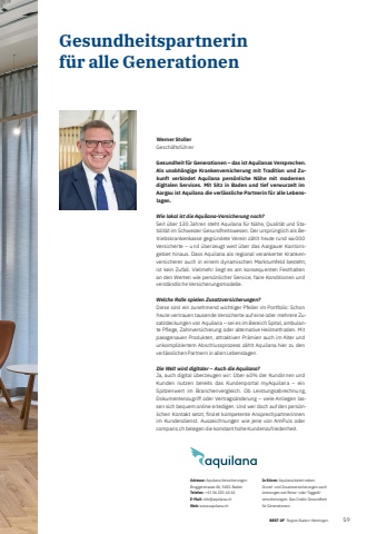 BEST OF Region Baden-Wettingen BEST OF Interview 592Adresse: Aquilana VersicherungenBruggerstrasse 46, 5401 BadenTelefon: +41 56 203 44 44E-Mail: info@aquilana.chWeb: www.aquilana.chIn K%u00fcrze: Aquilana bietet neben Grund- und Zusatzversicherungen auch Leistungen wie Reise- oder Taggeldversicherungen. Das Credo: Gesundheit f%u00fcr Generationen.Werner StollerGesch%u00e4ftsf%u00fchrer Gesundheit f%u00fcr Generationen %u2013 das ist Aquilanas Versprechen. Als unabh%u00e4ngige Krankenversicherung mit Tradition und Zukunft verbindet Aquilana pers%u00f6nliche N%u00e4he mit modernen digitalen Services. Mit Sitz in Baden und tief verwurzelt im Aargau ist Aquilana die verl%u00e4ssliche Partnerin f%u00fcr alle Lebenslagen.Wie lokal ist die Aquilana-Versicherung noch?Seit %u00fcber 130 Jahren steht Aquilana f%u00fcr N%u00e4he, Qualit%u00e4t und Stabilit%u00e4t im Schweizer Gesundheitswesen. Der urspr%u00fcnglich als Betriebskrankenkasse gegr%u00fcndete Verein z%u00e4hlt heute rund 66 000 Versicherte %u2013 und %u00fcberzeugt weit %u00fcber das Aargauer Kantonsgebiet hinaus. Dass Aquilana als regional verankerter Krankenversicherer auch in einem dynamischen Marktumfeld besteht, ist kein Zufall. Vielmehr liegt es am konsequenten Festhalten an den Werten wie pers%u00f6nlicher Service, faire Konditionen und verst%u00e4ndliche Versicherungsmodelle.Welche Rolle spielen Zusatzversicherungen?Diese sind ein zunehmend wichtiger Pfeiler im Portfolio: Schon heute vertrauen tausende Versicherte auf eine oder mehrere Zusatzdeckungen von Aquilana %u2013 sei es im Bereich Spital, ambulante Pflege, Zahnversicherung oder alternative Heilmethoden. Mit passgenauen Produkten, attraktiven Pr%u00e4mien auch im Alter und unkompliziertem Abschlussprozess z%u00e4hlt Aquilana hier zu den verl%u00e4sslichen Partnern in allen Lebenslagen.Die Welt wird digitaler %u2013 Auch die Aquilana?Ja, auch digital %u00fcberzeugen wir: %u00dcber 60 % der Kundinnen und Kunden nutzen bereits das Kundenportal myAquilana %u2013 ein Spitzen wert im Branchenvergleich. Ob Leistungsabrechnung, Dokumentenzugriff oder Vertrags%u00e4nderung %u2013 viele Anliegen lassen sich bequem online erledigen. Und wer doch auf den pers%u00f6nlichen Kontakt setzt, fi ndet kompetente Ansprechpartnerinnen im Kundendienst. Auszeichnungen wie jene von AmPuls oder comparis.ch belegen die konstant hohe Kundenzufriedenheit.Gesundheitspartnerin f%u00fcr alle Generationen