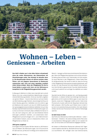 6012 BEST OF Region Baden und Wettingen Wohnen %u2013 Leben %u2013 Geniessen %u2013 ArbeitenDas Kehl in Baden war in den 60er-Jahren schweizweit eines der ersten Alterszentren, das Alterswohnen mit Dienstleistungen anbot. Das Konzept ist aktueller denn je. Die Bewohnenden k%u00f6nnen ein aktives soziales Leben f%u00fchren, sich mit j%u00fcngeren Generationen im Restaurant austauschen oder auch mal einen speziellen musikalischen Anlass erleben. Wenn der Pflegebedarf f%u00fcr die Inhouse-Spitex zu gross wird, kann von der Wohnung unkompliziert in die Pflegeabteilung gewechselt werden.In Bezug auf %u00abWohnen im Alter%u00bb kann das Kehl seit rund 60 Jahren eine den unterschiedlichen Bed%u00fcrfnissen entsprechende Wohnl%u00f6sung anbieten. Einst war das Kehl umgeben von gr%u00fcnen Wiesen %u2013 heute ist das Zentrum auf zwei Seiten von Wohn%u00fcberbauungen flankiert, das einstige Hochhaus ist einem Neubau gewichen. Geblieben sind die sch%u00f6ne Lage am Waldrand, die Aussicht und das mit 12000 Quadratmetern grossz%u00fcgig bemessene Gel%u00e4nde. Geblieben ist auch das Konzept: Das Kehl bietet einerseits 72 Alterswohnungen von 1,5 bis 3,5 Zimmern mit K%u00fcche, Bad und Balkon f%u00fcr Senior:innen, die noch r%u00fcstig sind, aber von verschiedenen Dienstleistungen profi tieren m%u00f6chten, und andererseits einen Pflegebereich auf sechs Etagen mit 1- und 2-Bett-Zimmern verschiedener Gr%u00f6ssen, wie es in %u00abklassischen%u00bb Alters- und Pflegeheimen zu fi nden ist.2016 gross umgebautEine eigene Inhouse-Spitex hilft den derzeit ca. 80 Mieterinnen und Mietern der Alterswohnungen, die im Durchschnitt 87 Jahre alt sind, auf Wunsch im Alltag und im medizinischen Bereich %u2013 bezogen auf kleinereunterst%u00fctzende Dienstleistungen. Wenn der Pflegeaufwand gr%u00f6sser wird und das ambulante Setting %u00fcberschritten wird, entscheiden sich die meisten f%u00fcr einen Wechsel in den Pflegebereich. Dieser bietet Platz f%u00fcr 68 Bewohnende. Der Vorteil im Kehl ist, dass der Einzug in den Pflegebereich keine grosse Umstellung bedeutet, weil sie den Ort, das Personal und viele Abl%u00e4ufe schon kennen. Auch der Kontakt zu gewonnenen Freunden bleibt bestehen und ist auch weiterhin ein wichtiger Grundpfeiler zum Leben im Kehl.Das Kehl konnte 2016 ein grosses Um- und Neubauprojekt fi nalisieren, in dessen Verlauf das bisherige Hochhaus abgebrochen und 52 modernen Wohnungen in zwei neuen Geb%u00e4uden, sowie eine Tiefgarage erstellt wurden. Dank eines Provisoriums musste w%u00e4hrend der Bauphase niemand das Kehl verlassen. 2019 durften auch Mieter:innen im Kehl 3 zur%u00fcck in ein saniertes Zuhause einziehen. Erst nach diesem Umbau konnte das Provisorium einer sch%u00f6nen Parkanlage weichen.Es l%u00e4uft etwas im KehlDas Motto des Alterszentrum Kehl lautet %u00abWohnen %u2013 Leben %u2013 Geniessen %u2013 Arbeiten%u00bb. Als Lebensmittelpunkt f%u00fcr Menschen in verschiedenen Altersgruppen wollen wir ein sozialer Ort sein. Ein Ort an dem sich Generationen begegnen k%u00f6nnen.Wir bieten im %u00f6ffentlichen Restaurant w%u00e4hrend 365 Tagen unsere Gastfreundschaft an. Bankette k%u00f6nnen Sie gerne bei uns durchf%u00fchren. Wir verf%u00fcgen %u00fcber zwei Seminarr%u00e4ume, BEST OF Region Baden-Wettingen