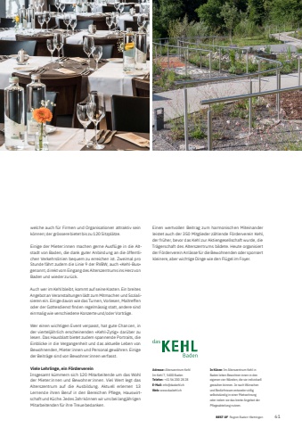 6113Adresse: Alterszentrum KehlIm Kehl 7, 5400 BadenTelefon: +41 56 200 28 28E-Mail: info@daskehl.ch Web: www.daskehl.chIn K%u00fcrze: Im Alterszentrum Kehl in Baden leben Bewohner:innen in den eigenen vier W%u00e4nden, die sie individuell gestalten k%u00f6nnen. Je nach W%u00fcnschen und Bed%u00fcrfnissen entweder v%u00f6llig selbstst%u00e4ndig in einer Mietwohnung oder indem sie das breite Angebot der Pflegeabteilung nutzen. welche auch f%u00fcr Firmen und Organisationen attraktiv sein k%u00f6nnen; der gr%u00f6ssere bietet bis zu 120 Sitzpl%u00e4tze. Einige der Mieter:innen machen gerne Ausfl%u00fcge in die Altstadt von Baden, die dank guter Anbindung an die %u00f6ffentlichen Verkehrslinien bequem zu erreichen ist. Zweimal pro Stunde f%u00e4hrt zudem die Linie 9 der RVBW, auch %u00abKehl-Bus%u00bb genannt, direkt vom Eingang des Alterszentrums ins Herz von Baden und wieder zur%u00fcck.Auch wer im Kehl bleibt, kommt auf seine Kosten. Ein breites Angebot an Veranstaltungen l%u00e4dt zum Mitmachen und Sozialisieren ein. Einige davon wie das Turnen, Vorlesen, Maltreffen oder der Gottesdienst fi nden regelm%u00e4ssig statt, andere sind einmalig wie verschiedene Konzerte und/oder Vortr%u00e4ge. Wer einen wichtigen Event verpasst, hat gute Chancen, in der viertelj%u00e4hrlich erscheinenden %u00abKehl-Zytig%u00bb dar%u00fcber zu lesen. Das Hausblatt bietet zudem spannende Portraits, die Einblicke in die Vergangenheit und das aktuelle Leben von Bewohnenden, Mieter:innen und Personal gew%u00e4hren. Einige der Beitr%u00e4ge sind von Bewohner:innen verfasst.Viele Lehrlinge, ein F%u00f6rdervereinInsgesamt k%u00fcmmern sich 120 Mitarbeitende um das Wohl der Mieter:innen und Bewohner:innen. Viel Wert legt das Alterszentrum auf die Ausbildung. Aktuell erlernen 13 Lernende ihren Beruf in den Bereichen Pflege, Hauswirtschaft und K%u00fcche. Jedes Jahr k%u00f6nnen wir uns bei langj%u00e4hrigen Mitarbeitenden f%u00fcr ihre Treue bedanken.Einen wertvollen Beitrag zum harmonischen Miteinander leistet auch der 350 Mitglieder z%u00e4hlende F%u00f6rderverein Kehl, der fr%u00fcher, bevor das Kehl zur Aktiengesellschaft wurde, die Tr%u00e4gerschaft des Alterszentrums bildete. Heute organisiert der F%u00f6rderverein Anl%u00e4sse f%u00fcr die Bewohnenden oder sponsert kleinere, aber wichtige Dinge wie den Fl%u00fcgel im Foyer.BEST OF BEST OFRegion Baden und Wettingen Region Baden-Wettingen