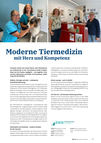 BEST OF Portrait xxx 673Moderne Tiermedizin mit Herz und KompetenzFran%u00e7oise Liechti und Janine Maurer sind Tier%u00e4rztinnen aus Leidenschaft. In der Tierarztpraxis L%u00e4ndli in Baden leben sie ihre Passion tagt%u00e4glich %u2013 und begleiten Tiere und ihre Halterinnen und Halter mit Fachwissen, Erfahrung und viel Herzblut. Medizin, Chirurgie und mehr %u2013 umfassende tier%u00e4rztliche BetreuungDie Kleintierpraxis L%u00e4ndli bietet von der Vorsorge bis zur spezialisierten Diagnostik eine ganzheitliche medizinische Versorgung f%u00fcr Hunde, Katzen und Nagetiere. Zur Prophylaxe geh%u00f6ren Impfungen nach den aktuellen Empfehlungen, das Chippen und Registrieren der Tiere sowie eine individuelle Beratung zu Entwurmung, Floh- und Zeckenprophylaxe. Auch in Ern%u00e4hrungsfragen stehen kompetente Beratung, eine Auswahl an hochwertigen Futtermitteln und die Zusammenarbeit mit der Online-Plattform PetPlus zur Verf%u00fcgung.Bei internistischen, onkologischen, neurologischen oder dermatologischen Fragestellungen werden moderne Diagnoseverfahren wie Blutanalysen, endokrinologische Tests, digitales R%u00f6ntgen, Ultraschall, Feinnadelpunktionen oder Biopsien angewandt. In komplexeren F%u00e4llen wird eng mit spezialisierten Fachstellen zusammengearbeitet. Chirurgisch ist die Praxis breit aufgestellt: Routinem%u00e4ssige Eingriffe wie Kastrationen oder Tumoroperationen erfolgen direkt vor Ort. Orthop%u00e4dische Eingriffe werden an ausgewiesene Spezialisten %u00fcberwiesen.Zahnmedizin und Verhalten %u2013 moderne Ans%u00e4tze f%u00fcr das TierwohlEin weiterer Schwerpunkt liegt in der Zahnmedizin. Mit dem digitalen Zahnr%u00f6ntgen k%u00f6nnen Zahnprobleme fr%u00fch erkannt und gezielt behandelt werden. Auch der Bereich VerhaltensAdresse: Kleintierpraxis im L%u00e4ndliL%u00e4ndliweg 4a, 5400 BadenTelefon: +41 56 210 97 00E-Mail: info@tierarzt-baden.chWeb: www.tierarzt-baden.chIn K%u00fcrze: Gesund, gl%u00fccklich und gut betreut %u2013 daf%u00fcr steht die Tierarztpraxis L%u00e4ndli.medizin spielt eine zunehmend wichtige Rolle: Verhaltensauff%u00e4lligkeiten und psychische Belastungen bei Haustieren werden ernst genommen und je nach Bedarf mit Verhaltenstherapie und, falls n%u00f6tig, mit medikament%u00f6ser Unterst%u00fctzung behandelt.Sicher versorgt %u2013 auch im NotfallDie Tierarztpraxis L%u00e4ndli ist Mitglied im regionalen Notfallring. Dieser gew%u00e4hrleistet, dass auch ausserhalb der regul%u00e4ren %u00d6ffnungszeiten jederzeit eine tier%u00e4rztliche Versorgung durch eine nahegelegene Praxis oder Klinik gew%u00e4hrleistet ist, was eine schnelle Hilfe im Notfall garantiert.F%u00fcr Tiere da %u2013 mit Verstand, Erfahrung und HerzBereits vor der Gr%u00fcndung der eigenen Praxis im Jahr 2008 arbeiteten Fran%u00e7oise Liechti und Janine Maurer mehrere Jahre zusammen in der Tierklinik Aarau West. %u00abUns verbindet derselbe Anspruch an unsere Arbeit und dieselben Werte%u00bb, sagt Janine Maurer. Fran%u00e7oise Liechti erg%u00e4nzt: %u00abWir kommen jeden Tag gerne in unserer Praxis. Unser Team ist grossartig, und kein Tag gleicht dem anderen.%u00bbBEST OF Region Baden-Wettingen
