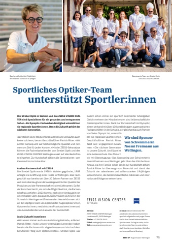 BEST OF Portrait xxx 7514 Sportliches Optiker-Team unterst%u00fctzt Sportler:innenAdresse:ZEISS VISION CENTER Wettingen Landstrasse 81, 5430 WettingenTelefon: +41 56 426 56 44E-Mail: wettingen@vision-center.comWeb: www.zeissvisioncenter.comIn K%u00fcrze: Gleich mehrere der Mitarbeitenden des %u00fcberdurchschnittlich sportlich aufgestellen und jungen Teams sind in ihrer Freizeit leidenschaftliche Sportler:innen. So liegt es nahe, als Unternehmen den Sport zu unterst%u00fctzen. Auch Sportler:innen ben%u00f6tigen Sehhilfen und eine qualifi zierte Beratung. Die Strebel Optik in Wohlen und das ZEISS VISION CENTER sind Spezialisten f%u00fcr ein gesundes und entspanntes Sehen. Als Dynoptic-Fachverbandsmitglied unterst%u00fctzen sie regionale Sportler:innen. Denn die Zukunft geh%u00f6rt der n%u00e4chsten Generation. %u00abWir stellen keine Wegwerfprodukte her und verkaufen auch keine solchen%u00bb, betont Gesch%u00e4ftsf%u00fchrer Patrick Ritter. %u00abWir achten konsequent auf h%u00f6chstm%u00f6gliche Qualit%u00e4t und nehmen uns Zeit f%u00fcr jeden Kunden.%u00bb Mit der ZEISS-Sehanalyse k%u00f6nnen die Fachmitarbeitenden von Strebel Optik und des ZEISS VISION CENTER Wettingen exakt auf alle Bed%u00fcrfnisse eingehen. Zur Kundschaft z%u00e4hlen alle Generationen: vom Kleinkind bis ins hohe Alter. Ausbau Partnerschaft mit ZEISSDie Strebel Optik wurde 1958 in Wohlen gegr%u00fcndet, 1989 erfolgte die Er%u00f6ffnung einer Filiale in Wettingen. Das Fachgesch%u00e4ft war bereits seit %u00fcber 20 Jahren Partner von ZEISS und stets %u00fcberzeugt von der aussergew%u00f6hnlichen Qualit%u00e4t der Produkte und der Partnerschaft mit dem Lieferanten. So fi el der Entscheid leicht, als sich die M%u00f6glichkeit bot, die Partnerschaft zu vertiefen. 2023 konnte, nach einer Umbauzeit von einem halben Jahr, das zweite ZEISS VISION CENTER in der Schweiz in Wettingen er%u00f6ffnet werden. Heute k%u00fcmmert sich ein 12-k%u00f6pfi ges Team von diplomierten Augenoptiker:innen, Optometrist:innen, medizinischen Praxisassistent:innen und vier Auszubildenden um das wohl der Kundschaft. In die Zukunft investieren%u00abWir waren immer auch ein Ausbildungsbetrieb%u00bb, erl%u00e4utert Patrick Ritter. %u00abViele unserer ehemaligen Lernenden haben bereits die Fachmaturit%u00e4t abgeschlossen und sind auf dem beruflichen Weg zum Optometristen.%u00bb Strebel Optik war zudem schon immer ein sportlich orientierter Arbeitgeber. Gleich mehrere der Mitarbeitenden sind leidenschaftliche Freizeitsportler:innen. Dank der Partnerschaft mit Dynoptic, einem Verband mit %u00fcber 100 unabh%u00e4ngigen augenoptischen Fachgesch%u00e4ften in der Schweiz, der gleichzeitig auch Partner von Swiss Olympic ist, unterst%u00fctzen sie regionale Sportler:innen. Gesch%u00e4ftsf%u00fchrer Patrick Ritter fasst sein Engagement zusammen: %u00abDie n%u00e4chste Generation ist unsere Zukunft. Und Sport ist eine Lebensschule. Das f%u00f6rdern wir mit %u00dcberzeugung.%u00bb Das Sponsoring von Schwimmerin Noemi Freimann aus Wettingen geht %u00fcber das %u00fcbliche Mass hinaus, da ihre Familie schon lange zur Kundschaft geh%u00f6rt. Patrick Ritter ist %u00fcberzeugt vom Potenzial und damit der Zukunft der talentierten und willensstarken 19-j%u00e4hrigen Schwimmerin, die bereits beachtliche nationale und internationale Erfolge vorweisen kann. Wir sind Sponsor von Schwimmerin Noemi Freimann aus Wettingen.Das Herbstfest bot die M%u00f6glichkeit, den direkten Austausch zu pflegen.Das gesamte Team von Strebel Optik und ZEISS VISION CENTER.BEST OF Region Baden-Wettingen