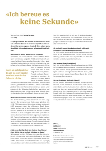 BEST OF BEST OF Promi 772%u00abIch bereue es keine Sekunde%u00bbText und Intervie Janine TschoppFoto: zVg14-j%u00e4hrig wechselte der Badener Glenn Hodel von Fussball auf Beach-Soccer. Im Interview spricht er unter anderem %u00fcber seinen eigenen Verein. Er liebt seinen Sport, obwohl die Rahmenbedingungen teilweise nicht einfach sind. Wie kamen Sie darauf, Beach-Soccer zu spielen?Ich komme aus einer Fussballer-Familie und habe diesen Sport von klein auf ausge%u00fcbt. Mit 14 Jahren habe ich zum ersten Mal Beach-Soccer gesehen. Es war der fr%u00fchere Nationalspieler Stephan Meier, der mich darauf gebracht hat. Von Anfang an hat mir Beach-Soccer viel Spass gemacht. Ich begann zu trainieren, und realisierte bald, dass es nicht m%u00f6glich sein w%u00fcrde, beides %u2013Fussball und Beach-Soccer %u2013 ernsthaft zu betreiben. So begann ich intensiv BeachSoccer zu spielen. Anfangs trainierte ich im Baselbiet mit Erwachsenen, Juniorenmannschaften gibt es bis heute nicht. Mit 16 Jahren wurde ich Mitglied der Schweizer Nationalmannschaft und spielte unter anderem in der Schweizer, italienischen, spanischen und skandinavischen Liga. Ich bereue es keine Sekunde, dass ich damals den Wechsel auf Beach-Soccer gemacht habe.Mit Fussball w%u00fcrden Sie aber viel mehr verdienen?Das stimmt eindeutig. Beach-Soccer ist eine sehr junge Sportart. Der entsprechende Weltverband gr%u00fcndete sich 1992, FIFA-Beachsoccer-Weltmeisterschaften werden seit 2005 organisiert. Auch als erfolgreicher Beach-SoccerSpieler verdient man in der Schweiz nichts. Finanziell und sportlich gesehen ist es attraktiver, im Ausland zu spielen. Aber auch da ist es unm%u00f6glich, von diesem Sport leben zu k%u00f6nnen. Es ist aus fi nanzieller Sicht sogar kaum m%u00f6glich, ein 100-Prozent-Arbeitspensum zu reduzieren. Neben meinem Studium in Sportwissenschaften arbeite ich seit neun Jahren in der Administration bei der Firma Orthopodo Malgaroli in Baden. Ich habe das Gl%u00fcck, dort sehr flexibel zu sein, da ich w%u00e4hrend der Saison extrem viel auf Reisen bin. 2022 waren Sie Mitgr%u00fcnder des Badener Beach Soccer Clubs BSC54. War es einfach, Mitglieder zu fi nden?Nein, das war es nicht. Wir haben einen sportlich hohen Anspruch, m%u00f6chten aber auch regionale Spieler in der Mannschaft haben. Ich bin sehr gl%u00fccklich mit unserer Mannschaft. Letztes Jahr wurden wir Schweizermeister und Cupsieger, und auch dieses Jahr holten wir den Schweizermeister- Titel. Alter: 29Gr%u00f6sse: 187 cmGewicht: 85 kgVorbild: Cristiano Ronaldo Sportliches Highlight:3. Platz an WM 2021In K%u00fcrze: Glenn Hodel war 14 Jahre alt, als er von Fussball auf Beach-Soccer wechselte. Seither ist er begeistert von diesem Sport und geh%u00f6rt weltweit zu den erfolgreichsten Spielern. Sportlich gesehen l%u00e4uft es sehr gut. In anderen Aspekten haben wir noch Potenzial. So w%u00e4re es sehr wichtig, mit einem gr%u00f6sseren Budget und Sponsoren die Rahmenbedingungen zu verbessern. Aufgrund unserer Kapazit%u00e4ten ist das aber nicht so einfach. Sie sind nicht nur mit dem Badener Verein erfolgreich, sondern auch mit der Nationalmannschaft.Ja. 2021 wurden wir mit der Schweizer Nationalmannschaft Dritte an der Weltmeisterschaft, und ich wurde Torsch%u00fctzenk%u00f6nig. 2022 wurden wir Europameister und 2023 entschieden wir die European Games f%u00fcr uns. Was bedeutet Ihnen Ihre Heimat?Sehr viel. Ich bin in Baden (D%u00e4ttwil) aufgewachsen und f%u00fchle mich im Aargau absolut zu Hause. Ich w%u00fcrde mich sehr freuen, wenn ich mich mit der grossen Leidenschaft f%u00fcr meinen Sport auch hier einbringen k%u00f6nnte. Mit dem BSC54, aber auch mit einem grossen Beach-Soccer Event, den ich f%u00fcr kommenden Sommer plane. Welche Ziele haben Sie f%u00fcr die Zukunft?Mit der Schweiz Weltmeister zu werden, ist mein gr%u00f6sster Wunsch. Zudem m%u00f6chte ich Beach-Soccer in der Schweiz und in Baden pushen. Auch wenn mein Leben mit Studium, Arbeit und Sport sehr anspruchsvoll ist und ich auch mental oftmals unter Druck stehe, w%u00fcnsche ich mir nichts anderes. Ich will mich nicht beklagen. Ich spiele Beach-Soccer mit viel Leidenschaft und liebe meinen Sport. Und wenn die Rahmenbedingungen noch ein bisschen professioneller w%u00e4ren, k%u00f6nnte man noch viel mehr herausholen.Auch als erfolgreicher Beach-Soccer-Spieler verdient man in der Schweiz nichts.