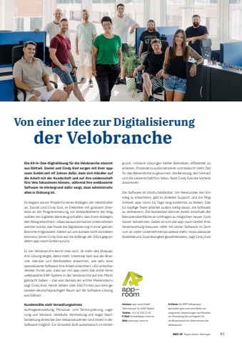 BEST OF Region Baden-Wettingen BEST OF Portrait xxx 818Von einer Idee zur Digitalisierung der VelobrancheAdresse: app-room GmbHT%u00e4fernstrasse 7a, 5405 D%u00e4ttwilTelefon: +41 32 510 21 43E-Mail: kontakt@app-room.chWeb: www.app-room.chIn K%u00fcrze: Als ERP-Softwaresystem bietet app-room eine Reihe von integrierten Anwendungen und Modulen zur Verwaltung der wichtigsten Gesch%u00e4ftsprozesse von Unternehmen der Velobranche.Die All-in-One-Digitall%u00f6sung f%u00fcr die Velobranche stammt aus D%u00e4ttwil. Daniel und Cindy Essl sorgen mit ihrer approom GmbH seit elf Jahren daf%u00fcr, dass sich H%u00e4ndler auf die Arbeit mit der Kundschaft und auf ihre Leidenschaft f%u00fcrs Velo fokussieren k%u00f6nnen, w%u00e4hrend ihre webbasierte Software im Hintergrund daf%u00fcr sorgt, dass administrativ alles in Ordnung ist.Es begann als ein Projekt f%u00fcr einen Kollegen, der Veloh%u00e4ndler ist. Daniel und Cindy Essl, er Elektriker mit grossem Interesse an der Programmierung, sie Verkaufsleiterin bei Volg, wollten ein digitales Werkzeug schaffen, das ihrem Kollegen den Alltag erleichtert. %u00abDass daraus einmal ein Unternehmen werden w%u00fcrde, das heute die Digitalisierung in einer ganzen Branche mitgestaltet, h%u00e4tten wir uns damals nicht vorstellen k%u00f6nnen%u00bb, blickt Cindy Essl auf die Anf%u00e4nge der 2014 gegr%u00fcndeten app-room GmbH zur%u00fcck.In der Velobranche kennt man sich. Je mehr das Ehepaar ihre L%u00f6sung zeigte, desto mehr Interesse kam aus der Branche. H%u00e4ndler und Werkst%u00e4tten erkannten, wie sehr eine spezialisierte Software ihre Arbeit erleichtert. %u00abEin entscheidender Punkt war, dass wir mit app-room das erste reine webbasierte ERP-System in der Velobranche auf den Markt gebracht haben %u2013 das war damals ein echter Meilenstein%u00bb, sagt Cindy Essl. Heute z%u00e4hlen %u00fcber 550 Firmen aus dem gesamten deutschsprachigen Raum auf die Software-L%u00f6sung aus D%u00e4ttwil.Kundenn%u00e4he statt VerwaltungsstressAuftragsverwaltung, Personal- und Terminplanung, Lagerung und Versand, Verk%u00e4ufe, Vermietung und sogar Nachbestellung direkt bei den Veloproduzenten sind direkt in der Software m%u00f6glich. Ein Grossteil l%u00e4uft automatisch im Hintergrund. %u00abUnsere L%u00f6sungen helfen Betrieben, effi zienter zu arbeiten, Prozesse zu automatisieren und dadurch mehr Zeit f%u00fcr das Wesentliche zu gewinnen: die Beratung, den Verkauf und die Leidenschaft f%u00fcrs Velo%u00bb, fasst Cindy Essl die Vorteile zusammen.Die Software ist intuitiv bedienbar. Um Neukunden den Einstieg zu erleichtern, gibt es direkten Support, und die M%u00f6glichkeit, app-room 14 Tage lang kostenlos zu testen. Das 11-k%u00f6pfi ge Team arbeitet zudem stetig daran, die Software zu verbessern. Die Nutzenden k%u00f6nnen direkt innerhalb der Benutzeroberfl%u00e4che an Umfragen zu m%u00f6glichen neuen Funktionen teilnehmen. Dabei ist sich die app-room GmbH ihrer Verantwortung bewusst. %u00abWer mit seiner Software im Zentrum so vieler Unternehmensprozesse steht, muss absolute Stabilit%u00e4t und Zuverl%u00e4ssigkeit gew%u00e4hrleisten%u00bb, sagt Cindy Essl.
