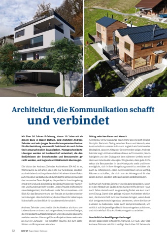 82 1 BEST OF Portrait xxxArchitektur, die Kommunikation schafft und verbindetMit %u00fcber 30 Jahren Erfahrung, davon 10 Jahre mit eigenem B%u00fcro in Baden-D%u00e4ttwil, sind Architekt Andreas Zehnder und sein junges Team die kompetenten Partner f%u00fcr die Gestaltung von sowohl funktional als auch %u00e4sthetisch anspruchsvollen Bauaufgaben. Massgeschneiderte L%u00f6sungen werden mit Leidenschaft entwickelt, die den Bed%u00fcrfnissen der Bewohnenden und Benutzenden gerecht werden, und zugleich architektonisch %u00fcberzeugen.Die Vision der Andreas Zehnder Architekten SIA AG ist es, Wohnr%u00e4ume zu schaffen, die nicht nur funktional, sondern auch einladend und inspirierend sind. Mit einem klaren Fokus auf innovative Gestaltung und durchdachte Details entwickelt das innovative Team Projekte, die perfekt in ihre Umgebung integriert sind und gleichzeitig den Bed%u00fcrfnissen der Kundinnen und Kunden gerecht werden. Jedes Projekt er%u00f6ffnet eine neue Gelegenheit, frische Ideen in die Tat umzusetzen %u2013 mit Blick f%u00fcr das Besondere und der Freude an kundenorientierten L%u00f6sungen. Also Architektur, die den Raum f%u00fcr Lebensqualit%u00e4t schafft und den Blick f%u00fcr das Wesentliche sch%u00e4rft.Andreas Zehnder umschreibt die Architektur als Kunst der Lebensr%u00e4ume und setzt auf zeitgem%u00e4sse, innovative Designs, die mit Bedacht auf Nachhaltigkeit und individuelle W%u00fcnsche realisiert werden. Die ausgef%u00fchrten Projekte bieten weit mehr als nur ein Zuhause %u2013 sie schaffen R%u00e4ume, die zum Wohlf%u00fchlen und Entspannen einladen.Dialog zwischen Raum und MenschArchitektur ist f%u00fcr das ganze Team mehr als eine %u00e4sthetische Disziplin. Sie ist ein Dialog zwischen Raum und Mensch, eine Ausdrucksform unserer Kultur und zugleich ein funktionales Bindeglied, das den Alltag der Bewohnenden pr%u00e4gt. Andreas Zehnder sagt: %u00abMit einem klaren Fokus auf Innovation, Nachhaltigkeit und den Dialog mit dem n%u00e4heren Umfeld entwickeln wir individuelle L%u00f6sungen. Wir glauben, dass gute Architektur die Benutzenden in den Mittelpunkt stellt und ihnen erm%u00f6glicht, sich in ihrer Umgebung sowohl zu entfalten als auch zu reflektieren.%u00bb Dem Architektenteam ist es wichtig, R%u00e4ume zu schaffen, die nicht nur als Hintergrund f%u00fcr das Leben dienen, sondern aktiv zum Leben selbst beitragen.So freut sich Andreas Zehnder jeweils ganz besonders, wenn er in der Altstadt von Baden einen Kunden trifft, der sein Haus auch Jahre danach noch so grossartig fi ndet wie kurz nach dem Einzug. Damit dies gelingt, m%u00fcssen Architekten ehrlich sein, die Kundschaft zum Nachdenken bringen, wenn diese sich designtechnisch irgendwo verrennen, ohne die Konsequenzen zu bedenken. Aber auch kompromissbereit, um wirklich auf die jeweiligen Bed%u00fcrfnisse eingehen zu k%u00f6nnen, und nicht einfach f%u00fcrs Architekturmagazin zu arbeiten.Durchblick im Bewilligungs-DschungelDieser Balanceakt erfordert Erfahrung. Ein Gut, %u00fcber das Andreas Zehnder reichlich verf%u00fcgt. Nach %u00fcber 20 Jahren als BEST OF Region Baden-Wettingen