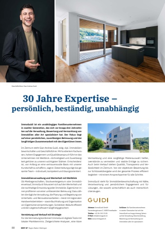88 BEST OF Region Baden-Wettingen 1 BEST OF Portrait xxx 30 Jahre Expertise %u2013 pers%u00f6nlich, best%u00e4ndig, unabh%u00e4ngigAdresse: ImmoGuidi GmbHSonnenbergstrasse 2, 5408 EnnetbadenTelefon: +41 56 241 21 81E-Mail: info@immoguidi.chWeb: www.immoguidi.chIn K%u00fcrze: Als Familienunternehmen in zweiter Generation hat sich die ImmoGuidi vor knapp dreissig Jahren auf die Verwaltung, Bewirtschaftung, Bewertung und Vermarktung von Immobilien aller Art spezialisiert.ImmoGuidi ist ein unabh%u00e4ngiges Familienunternehmen in zweiter Generation, das sich vor knapp drei Jahrzehnten auf die Verwaltung, Bewertung und Vermarktung von Immobilien aller Art spezialisiert hat. Der Fokus liegt auf einer pers%u00f6nlichen, zuverl%u00e4ssigen Betreuung und der langfristigen Zusammenarbeit mit den Eigent%u00fcmer:innen.Im Zentrum steht Gian Andrea Guidi, eidg. dipl. Immobilienbewirtschafter und Gesch%u00e4ftsf%u00fchrer. Mit fundiertem Fachwissen, hohem Engagement und Qualit%u00e4tsanspruch f%u00fchrt er das Unternehmen mit Weitblick. %u00abSchnelligkeit und Zuverl%u00e4ssigkeit geh%u00f6ren zu unseren wichtigsten St%u00e4rken. Entscheidend ist, von Anfang an eine vertrauensvolle Basis mit unserer Kundschaft zu schaffen%u00bb, sagt er. Diese Haltung pr%u00e4gt das gesamte Team %u2013 individuell, kompetent und l%u00f6sungsorientiert.Immobilienverwaltung und Werterhalt mit Weitblick Ob Mietliegenschaften, Stockwerkeigentum oder Immobilienverkauf, ImmoGuidi fokussiert sich auf den Werterhalt und die nachhaltige Entwicklung jeder Immobilie. Eigent%u00fcmer:innen profi tieren von einer umfassenden Betreuung: Dazu z%u00e4hlen die t%u00e4gliche Verwaltung, die Planung und Begleitung von Unterhalts- und Renovationsarbeiten %u2013 meist mit regionalen Handwerksbetrieben %u2013 sowie Buchhaltung und Organisation von Eigent%u00fcmerversammlungen. So bleiben Abl%u00e4ufe effi zient und der Liegenschaftswert langfristig gesichert.Vermietung und Verkauf mit StrategieF%u00fcr die Vermietung kombiniert ImmoGuidi digitale Tools mit lokaler Marktkenntnis. Zielgerichtete Analysen, eine klare Vermarktung und eine sorgf%u00e4ltige Mieterauswahl helfen, Leerst%u00e4nde zu vermeiden und stabile Ertr%u00e4ge zu sichern.Auch beim Verkauf stehen Qualit%u00e4t, Transparenz und Verl%u00e4sslichkeit im Zentrum. Von der objektiven Bewertung bis zur Schl%u00fcssel%u00fcbergabe wird der gesamte Prozess effi zient begleitet %u2013 mit einem Ansprechpartner f%u00fcr alle Schritte.ImmoGuidi steht f%u00fcr Immobilienbewirtschaftung mit N%u00e4he, Verantwortung und pers%u00f6nlichem Engagement und f%u00fcr L%u00f6sungen, die sowohl wirtschaftlich als auch menschlich %u00fcberzeugen.Gesch%u00e4ftsf%u00fchrer Gian Andrea Guidi