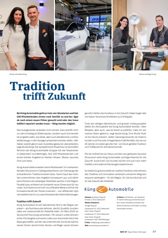 11 BEST OF Region Baden-Wettingen BEST OF Portrait xxx 8911Tradition trifft ZukunftAdresse: Autohaus K%u00fcng AGIm Halt 2, 5412 GebenstorfWeitere Standorte:Garage K%u00fcng AGLandstrasse 53, 5412 GebenstorfAuto-Center K%u00fcng AGLandstrasse 73, 5412 GebenstorfAuto-Center K%u00fcng AGLandstrasse 148, 5430 WettingenE-Mail: info@kueng-automobile.ch Web: www.kueng-automobile.ch In K%u00fcrze: F%u00fcnf Marken, vier Standorte, 75 Jahre Erfahrung und h%u00f6chste Qualit%u00e4t in einem famili%u00e4ren Ambiente. Das d%u00fcrfen Kundinnen und Kunden von K%u00fcng Automobile erwarten.Nicole und Stefan K%u00fcng Nicole und Roger K%u00fcngBei K%u00fcng Automobile geht es trotz vier Standorten und fast 100 Mitarbeitenden immer noch famili%u00e4r zu und her. Egal ob nach einem neuen Flitzer gesucht wird oder das treue Gef%u00e4hrt repariert werden muss %u2013 K%u00fcng machts m%u00f6glich.Das Autogewerbe ver%u00e4ndert sich schnell. Dies betrifft nicht nur den Umstieg auf Elektroautos, sondern auch die Herstellervorgaben daf%u00fcr, wie diese, aber auch alle Benziner und Dieselfahrzeuge, in den Garagen pr%u00e4sentiert werden sollen. %u00abWir haben zuletzt gleich zwei Ausstellungsr%u00e4ume %u00fcberarbeitet%u00bb, sagt Nicole K%u00fcng. Die sympathische Powerfrau ist Gesch%u00e4ftsf%u00fchrerin der K%u00fcng Automobile-Gruppe mit vier Standorten in Gebenstorf und Wettingen, fast 100 Mitarbeitenden und einem breiten Angebot an Marken: Nissan, %u0160koda, Hyundai, Ford und Volvo. K%u00fcng Automobile erweitert seine Markenwelt: Im markanten Rondell-Showroom in Geelig pr%u00e4sentieren sich Fahrzeuge der schwedischen Traditionsmarke Volvo. Damit baut das Familien-unternehmen sein Angebot konsequent aus und st%u00e4rkt seine Position als vielseitiger Mobilit%u00e4ts-partner in der Region. Parallel dazu entstand ein komplett neuer Showroom f%u00fcr Hyundai. Auf moderne und licht-durchflutete Weise wird hier die Innovationskraft der Marke inszeniert %u2013 von effi zienten Hybridmodellen bis hin zu zukunftsweisenden Elektrofahrzeugen. Tradition trifft ZukunftK%u00fcng Automobile ist seit Jahrzehnten fest in der Region verankert %u2013 als Familienunternehmen, das f%u00fcr Qualit%u00e4t, Kundenn%u00e4he und Leidenschaft f%u00fcr Mobilit%u00e4t steht. Im M%u00e4rz 2025 ist Seniorchef Max K%u00fcng verstorben. Mit seinem unternehmerischen Pioniergeist und seiner Liebe zum Automobil hat er die Basis geschaffen, auf der das Unternehmen bis heute w%u00e4chst. Heute f%u00fchren seine Kinder Nicole und Roger sowie Schwiegersohn Stefan das Autohaus in die Zukunft. Dabei tragen alle mit klaren Verantwortlichkeiten zum Erfolg bei.Trotz des stetigen Wachstums und grosser Umbauprojekte bleibt die Atmosph%u00e4re bei K%u00fcng Automobile famili%u00e4r. %u00abDen Respekt, aber auch, was es heisst zu arbeiten, habe ich von meinen Eltern gelernt%u00bb, sagt Nicole K%u00fcng. Ihre Mutter Ruth ist bis heute pr%u00e4sent: Jeden Samstag bewirtet sie Stammkunden und Freunde im legend%u00e4ren Caf%u00e9 Rondell, das sie vor 30 Jahren ins Leben gerufen hat %u2013 ein St%u00fcck gelebte Tradition und Treffpunkt f%u00fcr die Gemeinschaft.Mit der Aufnahme von Volvo und dem neu gebauten Hyundai Showroom setzt K%u00fcng Automobile wichtige Akzente f%u00fcr die Zukunft. Kundinnen und Kunden d%u00fcrfen sich auf noch mehr Vielfalt und moderne Fahrzeugkonzepte freuen. So bleibt K%u00fcng Automobile ein starkes Familienunternehmen, das Tradition und Innovation verbindet und seinen Weg konsequent weitergeht %u2013 f%u00fcr die Region, f%u00fcr die Kundschaft und f%u00fcr die Zukunft der Mobilit%u00e4t.
