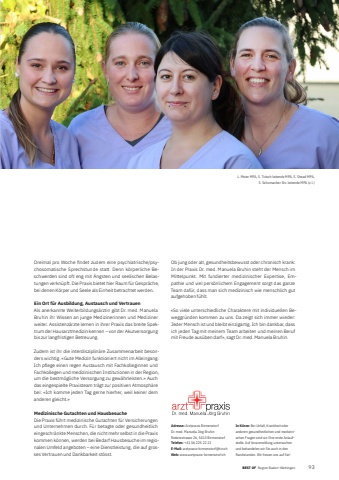 BEST OF Region Baden-Wettingen BEST OF Portrait xxx 932Adresse: Arztpraxis BirmenstorfDr. med. Manuela J%u00f6rg BruhinRieterestrasse 26, 5413 BirmenstorfTelefon: +41 56 225 22 22E-Mail: arztpraxis-birmenstorf@hin.chWeb: www.arztpraxis-birmenstorf.chIn K%u00fcrze: Bei Unfall, Krankheit oder anderen gesundheitlichen und medizinischen Fragen sind wir Ihre erste Anlaufstelle. Auf Voranmeldung untersuchen und behandelen wir Sie auch in den Randstunden. Wir freuen uns auf Sie!Dreimal pro Woche fi ndet zudem eine psychiatrische/psychosomatische Sprechstunde statt. Denn k%u00f6rperliche Beschwerden sind oft eng mit %u00c4ngsten und seelischen Belastungen verkn%u00fcpft. Die Praxis bietet hier Raum f%u00fcr Gespr%u00e4che, bei denen K%u00f6rper und Seele als Einheit betrachtet werden.Ein Ort f%u00fcr Ausbildung, Austausch und VertrauenAls anerkannte Weiterbildungs%u00e4rztin gibt Dr. med. Manuela Bruhin ihr Wissen an junge Medizinerinnen und Mediziner weiter. Assistenz%u00e4rzte lernen in ihrer Praxis das breite Spektrum der Hausarztmedizin kennen %u2013 von der Akutversorgung bis zur langfristigen Betreuung.Zudem ist ihr die interdisziplin%u00e4re Zusammenarbeit besonders wichtig. %u00abGute Medizin funktioniert nicht im Alleingang. Ich pflege einen regen Austausch mit Fachkolleginnen und Fachkollegen und medizinischen Institutionen in der Region, um die bestm%u00f6gliche Versorgung zu gew%u00e4hrleisten.%u00bb Auch das eingespielte Praxisteam tr%u00e4gt zur positiven Atmosph%u00e4re bei: %u00abIch komme jeden Tag gerne hierher, weil keiner dem anderen gleicht.%u00bbMedizinische Gutachten und HausbesucheDie Praxis f%u00fchrt medizinische Gutachten f%u00fcr Versicherungen und Unternehmen durch. F%u00fcr betagte oder gesundheitlich eingeschr%u00e4nkte Menschen, die nicht mehr selbst in die Praxis kommen k%u00f6nnen, werden bei Bedarf Hausbesuche im regionalen Umfeld angeboten %u2013 eine Dienstleistung, die auf grosses Vertrauen und Dankbarkeit st%u00f6sst.Ob jung oder alt, gesundheitsbewusst oder chronisch krank: In der Praxis Dr. med. Manuela Bruhin steht der Mensch im Mittelpunkt. Mit fundierter medizinischer Expertise, Empathie und viel pers%u00f6nlichem Engagement sorgt das ganze Team daf%u00fcr, dass man sich medizinisch wie menschlich gut aufgehoben f%u00fchlt.%u00abSo viele unterschiedliche Charaktere mit individuellen Beweggr%u00fcnden kommen zu uns. Da zeigt sich immer wieder: Jeder Mensch ist und bleibt einzigartig. Ich bin dankbar, dass ich jeden Tag mit meinem Team arbeiten und meinen Beruf mit Freude aus%u00fcben darf%u00bb, sagt Dr. med. Manuela Bruhin.L. Meier MPA, S. Tr%u00f6sch leitende MPA, S. Shead MPA, S. Schumacher Stv. leitende MPA (v. l.)