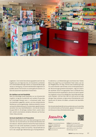 BEST OF Portrait xxx 9731Adresse: Amavita Apotheke W%u00fcrenlosL%u00e4ndliweg 2, 5436 W%u00fcrenlosTelefon: +41 58 878 19 40E-Mail: apotheke.wuerenlos@amavita.chWeb: www.amavita.chIn K%u00fcrze: Die ehemalige L%u00e4ndliApotheke geh%u00f6rt neu zur Amavita-Kette. Dies bringt f%u00fcr unsere Kundschaft eine ganze Palette an neuen Gesundheitsdienstleistungen mit sich.angeboten. Eine breite Dienstleistungspalette zeichnet das Angebot aus und tr%u00e4gt dazu bei, die Haus%u00e4rzte zu entlasten. %u00abF%u00fcr diskrete Behandlungen stehen uns separate Beratungsr%u00e4ume zur Verf%u00fcgung, und damit die Wartezeit m%u00f6glichst kurz ausf%u00e4llt, k%u00f6nnen Termine bei uns online gebucht werden%u00bb, erkl%u00e4rt die diplomierte Apothekerin Nicole Henz. Ein Jubil%u00e4um und viel Flexibilit%u00e4tDass die ehemalige L%u00e4ndli-Apotheke nun zur Amavita-Kette geh%u00f6rt, bringt der Kundschaft noch weitere Pluspunkte. Auf hinterlegte Rezepte kann in schweizweit jeder Amavita Apotheke zugegriffen werden und das entsprechende Medikament wird ausgeh%u00e4ndigt. %u00abSelbstverst%u00e4ndlich ist eine vertrauliche Behandlung der Kundendaten gew%u00e4hrleistet%u00bb, versichert die neue Gesch%u00e4ftsleiterin. Und da die AmavitaGruppe 2025 ihr 20-j%u00e4hriges Jubil%u00e4um feiert, warten %u00fcbers Jahr verteilt verschiedene attraktive Aktionen auf die Apotheken-Besuchenden.Vertraute Apothekerin mit PluspunktenW%u00e4hrend die Aktionen noch eine %u00dcberraschung sind, ist Nicole Henz der Kundschaft aus der Gemeinde W%u00fcrenlos bestens bekannt. %u00abBereits w%u00e4hrend meines Pharmazie-Studiums begann ich in der L%u00e4ndli-Apotheke zu arbeiten, f%u00fcnf Jahre bin ich jetzt dort t%u00e4tig%u00bb, erkl%u00e4rt die Fachfrau. Aktuell befi ndet sie sich in der zweij%u00e4hrigen Weiterbildung zur Fachapothekerin. Fundierte Aus- und Weiterbildungen sind Nicole Henz%u2019 St%u00e4rke. Bevor die junge Frau zum Apotheken-Team stiess, war sie als Pflegefachfrau HF t%u00e4tig. %u00abMeine erste Ausbildung bringt f%u00fcr unsere Klienten viele Vorteile, so bin ich beispielsweise in der Wundversorgung bestens bewandert%u00bb, sagt die Leiterin der Apotheke. Ohne ihr eingespieltes Team und Renate Droz, Fachverantwortliche Apothekerin, k%u00f6nnte sie solche speziellen Angebote und auch die allt%u00e4glichen Gesch%u00e4fte allerdings nicht meistern. %u00abIch bin froh, darf ich mich auf ein so langj%u00e4hriges Team verlassen, einige unserer Mitarbeitenden sind bereits seit 35 Jahren mit dabei%u00bb, schw%u00e4rmt die Gesch%u00e4ftsf%u00fchrerin. Die Amavita Apotheke W%u00fcrenlos punktet also auch zuk%u00fcnftig mit viel Kontinuit%u00e4t und Fachwissen, gepaart mit einem grossen Strauss an Gesundheitsdienstleistungen. BEST OF Region Baden-Wettingen