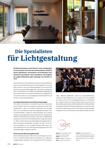 102 44 BEST OF BEST OF Region Biel Portrait xxx Die Spezialistenf%u00fcr LichtgestaltungAdresse: Lichtmanufaktur GmbHBielstrasse 1, 2543 LengnauTelefon: +41 32 355 15 15E-Mail: info@licht-manufaktur.chWeb: www.licht-manufaktur.chIn K%u00fcrze: Wir sind Spezialisten in Sachen Lichtgestaltung. Bei uns sind Sie aber auch mit allen anderen Anliegen im Bereich Elektrotechnik an der richtigen Adresse.Die Beleuchtung kann einen Raum in einen einzigartigen Ort verwandeln. Das Team der Lichtmanufaktur GmbH ist darauf spezialisiert, harmonische und funktionale Lichtkonzepte auszuarbeiten und zu installieren. Das Angebot der jungen Elektrofi rma geht allerdings weit dar%u00fcber hinaus.Das Interesse am Thema Beleuchtung hat f%u00fcnf junge Berufsm%u00e4nner aus der Elektrobranche zusammengef%u00fchrt. Aus einer Idee und dem Traum der Selbstst%u00e4ndigkeit wurde das Unternehmen Lichtmanufaktur gegr%u00fcndet, das Andy Leuenberger f%u00fchrt. %u00ab2018 haben wir im Beleuchtungssektor losgelegt und als ich die H%u00f6here Fachschule f%u00fcr Elektrotechnik abgeschlossen hatte, konnten wir unser Angebot auf diesen Bereich ausweiten%u00bb, so der Gesch%u00e4ftsleiter.Von Elektroladestationen bis PhotovoltaikanlagenDen beiden Lernenden und nat%u00fcrlich auch der Kundschaft kommt zugute, dass das Lengnauer Unternehmen sehr breit aufgestellt ist. %u00abBei uns hat jeder Mitarbeiter sein Fachgebiet, sei es die Beleuchtung, die Geb%u00e4udeautomation oder die Photovoltaik%u00bb, erz%u00e4hlt der Gesch%u00e4ftsleiter. Die Lichtmanufaktur ist kompetente Ansprechpartnerin f%u00fcr die gesamte Palette an Elektrodienstleistungen, wobei die Lichtgestaltung die grosse Leidenschaft und Spezialit%u00e4t der Jungunternehmer ist. Wer in seinem Zuhause mittels Beleuchtungselementen eine besondere Atmosph%u00e4re schaffen m%u00f6chte, ist bei der Lichtmanufaktur an der richtigen Adresse. Aber auch, wer eine Ladestation f%u00fcr sein Elektroauto ben%u00f6tigt oder eine Photovoltaikanlage installieren m%u00f6chte. Sanierung des BeleuchtungskonzeptsDiese Dienstleistungen bietet Andy Leuenberger und sein Team im Gebiet zwischen Biel und Solothurn an. %u00abBeleuchtungskonzepte realisieren wir haupts%u00e4chlich f%u00fcr Privathaushalte, Elektroinstallationen meist f%u00fcr Gewerbebetriebe%u00bb, erkl%u00e4rt der Gesch%u00e4ftsf%u00fchrer. Die innovative Firma empfi ehlt sich aber nicht nur f%u00fcr die Neugestaltung von Lichtkonzepten, sondern ebenso f%u00fcr deren Sanierung und auch bei Einfamilienh%u00e4usern k%u00f6nnen die Mitarbeiter der Lichtmanufaktur kompetent s%u00e4mtliche Elektroinstallationen vornehmen. Eine pers%u00f6nliche Beratung und die individuelle Umsetzung jedes Projektes ist f%u00fcr die Fachm%u00e4nner eine Selbstverst%u00e4ndlichkeit.