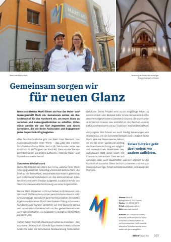 BEST OF BEST OF Portrait xxx Region Biel 10350Gemeinsam sorgen wir f%u00fcr neuen GlanzAdresse: Marti AGByfangstrasse 9, 2552 OrpundTelefon: +41 32 355 12 74E-Mail: info@malermarti.ch Web: www.malermarti.chIn K%u00fcrze: Der Auswahl der Arbeitstechniken und Materialien auf nat%u00fcrlicher Basis schenkt die Marti AG viel Aufmerksamkeit. Auch Spezielle dekorative Techniken werden immer wieder sehr gerne ausgef%u00fchrt.Sanierung der Kirche des vormaligen Klosters Gottstatt in OrpundRemo und Bettina Marti f%u00fchren als Paar das Maler- undGipsergesch%u00e4ft Marti AG. Gemeinsam setzen sie ihre Leiden schaft f%u00fcr das Handwerk ein, um neuen Glanz zu verleihen und Aussergew%u00f6hnliches zu schaffen. Unterst%u00fctzt werden sie von f%u00fcnf Angestellten und einem Lernen den, die mit ihrem Fachwissen und Engagement jedes Projekt tatkr%u00e4ftig begleiten.%u00abDas Durchschnittliche gibt der Welt ihren Bestand, das Ausser gew%u00f6hnliche ihren Wert%u00bb %u2013 das Zitat des irischen Schriftstellers Oscar Wilde, der im 19. Jahrhundert lebte, versinnbildlicht die T%u00e4tigkeit der Marti AG. Denn %u00abunser Service geht dort weiter, wo andere aufh%u00f6ren%u00bb, hebt die Maler- und Gipserfi rma weiter hervor.Zusammen sind wir starkRemo Marti leitet seit 2021 die Firma, welche Peter Marti 1952 gegr%u00fcndet hat. Tatkr%u00e4ftig unterst%u00fctzt Bettina Marti, die Ehefrau von Remo Marti, welche ebenfalls Malerin gelernt hat und diplomierte Vorarbeiterin ist. Die administrativen Arbeiten sind unter dem Ehepaar aufgeteilt, zus%u00e4tzlich erh%u00e4lt das Team stundenweise Unterst%u00fctzung von einer Angestellten. Bei der Marti AG stehen nicht nur Farben im Mittelpunkt, sondern auch die Menschen und der pers%u00f6nliche Austausch. %u00abWir sind %u00fcberzeugt, dass durch gute Kommunikation die besten Ergebnisse entstehen. Durch den direkten Dialog mit unseren Kundinnen und Kunden verstehen wir ihre W%u00fcnsche genau und setzen sie mit Leidenschaft um. Nur gemeinsam k%u00f6nnen wir Projekte schaffen, die begeistern%u00bb, bringt es Remo Marti auf den Punkt. Farben haben die Kraft, R%u00e4ume zum Leben zu erwecken %u2013 das ist unsere Leidenschaft. Ob edle Spachteltechniken, stil volle Anstriche oder die behutsame Restaurierung historischer Geb%u00e4ude: Jedes Projekt wird durch sorgf%u00e4ltige Arbeit zu einem Unikat. %u00abEin Beispiel daf%u00fcr ist die restaurierte Kirche des ehemaligen Klosters Gottstatt in Orpund, die durch unsere Arbeit im Inneren neu erstrahlt ist. Ein Zeichen unserer Liebe zum Handwerk und zur Tradition%u00bb, erz%u00e4hlt Bettina Marti.%u00abIn j%u00fcngster Zeit f%u00fchren wir auch h%u00e4ufi g Sanierungen von W%u00e4nden aus, die von Schimmel befallen sind%u00bb, erg%u00e4nzt Remo Marti. Wie der Malermeister betont, sei es bei einer Sanierung wichtig, die Wandbeschichtung wo m%u00f6glich mit mineralischen Materialien neu aufzubauen statt diese rasch mit Chemie zu behandeln. Dies sei aufwendiger, aber auch dauerhafter, was sich letztlich f%u00fcr die Kundschaft auszahle. Diese fachlich zu beraten und mit qualitativ hochwertiger Arbeit zufriedenzustellen, ist das Ziel der Marti AG.Unser Service geht dort weiter, wo andere aufh%u00f6ren.Remo und Bettina Marti