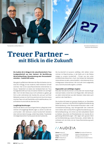 106 8 BEST OF BEST OF Region Biel Portrait xxxTreuer Partner %u2013 mit Blick in die ZukunftAdresse: Audizia AGErlenstrasse 27, 2555 Br%u00fcggTelefon: +41 32 505 32 00E-Mail: info@audizia.chWeb: www.audizia.chIn K%u00fcrze: Die Audizia AG bietet eine Vielzahl an Dienstleistungen an %u2013 Unabh%u00e4ngig von der Branche ist das Unternehmen die ideale Partnerin.Die Audizia AG befi ndet sich in modernsten R%u00e4umlichkeiten. Die Audizia AG in Br%u00fcgg ist die zukunftsorientierte Treuhandgesellschaft aus dem Seeland. Ob Buchf%u00fchrung, Wirtschaftspr%u00fcfung, Steuerberatung oder Personaladministration %u2013 Audizia hilft weiter.Was gleich auff%u00e4llt beim Betreten der R%u00e4umlichkeiten der Audizia AG in Br%u00fcgg, ist das moderne, helle Ambiente. Schnell wird klar: Hier ist ein zukunftsorientiertes Unternehmen zu Hause. Tats%u00e4chlich ist neben der Verl%u00e4sslichkeit der Treuhandgesellschaft auch das innovative Arbeiten ein wichtiger Wert. Sich mit dem Status Quo nicht zufrieden zu geben, geh%u00f6rt zu den Leitmotiven der Audizia AG, wie auch auf ihrer Webseite zu lesen ist. Die Firma zeichnet sich durch ein dynamisches Team mit viel Flexibilit%u00e4t und Einsatzfreude aus, mit zufriedener Kundschaft als oberstes Ziel.Langj%u00e4hrige BeziehungenObwohl der Blick in die Zukunft gerichtet ist, pflegt das Unternehmen oft langj%u00e4hrige Beziehungen zu seinen Kundinnen und Kunden: %u00abWir betreuen unsere Kundschaft meistens %u00fcber mehrere Jahre hinweg%u00bb, erkl%u00e4rt Dave Keller, Treuh%u00e4nder mit eidgen%u00f6ssischem Fachausweis bei der Audizia AG. Die Kundschaft ist %u00e4usserst vielf%u00e4ltig: %u00abWir z%u00e4hlen Unternehmen im Maschinenbau, in der Optik und in der Meteoro logie zu unserer Kundschaft %u2013 Firmen aus den unterschiedlichsten Branchen.%u00bb Auch die Gr%u00f6sse der betreuten Unternehmen ist sehr unterschiedlich: %u00abVon kleineren bis zu mittel grossen Unternehmen: Wir sind sehr breit aufgestellt, was unsere Kundschaft angeht%u00bb, so Keller. Regionalit%u00e4t und vielf%u00e4ltiges AngebotWas aber fast alle Kundinnen und Kunden der Audizia AG gemeinsam haben, ist der Sitz in der Region Biel. %u00abWir betreuen vor allem Unternehmen aus dem Seeland, haben aber auch welche in der Stadt Bern.%u00bb Die Audizia AG bietet ein grosses Spektrum an Dienstleistungen an, wie etwa in der Buchf%u00fchrung/Abschlussberatung, Steuerberatung, in der Personaladministration oder in der Immobilienverwaltung. Das Kerngesch%u00e4ft des Unternehmens bilden aber die Buchf%u00fchrung/Abschlussberatung und Wirtschaftspr%u00fcfung. Um immer auf dem aktuellsten Stand zu bleiben, besuchen die Mitarbeitenden der Audizia AG regelm%u00e4ssig Weiterbildungen: %u00abWir legen sehr grossen Wert auf die Weiterbildung unseres Personals%u00bb, erkl%u00e4rt Keller. So schliesst sich der Kreis mit der Zukunftsorientierung auch hier wieder. Flip Apostolov und Dave Keller (v. l.)