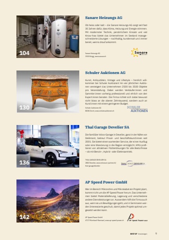 BEST OF Voranzeigen 9BEST OF Teaser 2Schuler Auktionen AGKunst, Antiquit%u00e4ten, Vintage und Lifestyle %u2013 herzlich willkommen bei Schuler Auktionen! An vier j%u00e4hrlichen Auktionen versteigert das Unternehmen 2500 bis 3500 Objekte pro Veranstaltung. Dabei werden Verk%u00e4ufer:innen und Sammler:innen vorherig professionell und ehrlich von den Expert:innen beraten. Die Firma richtet sich dabei bewusst nicht bloss an die oberen Zehntausend, sondern auch an Kund:innen mit einem geringeren Budget. Schuler Auktionen AG8038 Z%u00fcrich, www.schulerauktionen.chThal Garage Develier SADie famili%u00e4re Volvo-Garage in Develier, ganz in der N%u00e4he von Del%u00e9mont, betreut Privat- und Gesch%u00e4ftskund:innen seit 2001. Sie bietet einen wartenden Service, der einen Ausflug oder eine Wanderung in die Region erm%u00f6glicht. KMU profi -tieren von attraktiven Flottenl%u00f6sungen f%u00fcr alle Bed%u00fcrfnisse %u2013 ob mit Benzin-, Hybrid- oder Elektroantrieb. Sanare Heizungs AGOb heiss oder kalt %u2013 die Sanare Heizungs AG sorgt seit fast 30 Jahren daf%u00fcr, dass Klima, Heizung und Energie stimmen. Mit modernster Technik, pers%u00f6nlichem Einsatz und viel Know-how bietet das Unternehmen im Seeland massgeschneiderte L%u00f6sungen %u2013 nachhaltig, kundennah und immer bereit, wenns drauf ankommt.THAL GARAGE DEVELIER SA2802 Develier, www.volvocars-partner.ch/thal-garage/develierSanare Heizungs AG2555 Br%u00fcgg, www.sanare.ch104136130AP Speed Power GmbHWer im Bereich Mikrorohre und Mikrokabel ein Projekt plant, kommt nicht um die AP Speed Power herum. Das Unternehmen bietet Materiallieferung, Lagerung und verschiedene andere Dienstleistungen an. Ausserdem hilft die Firma auch aus, wenn es um Bewilligungen geht, und in Seminaren werden Interessierte geschult, damit jedes Projekt optimal umgesetzt werden kann. AP Speed Power GmbH4717 M%u00fcmliswil-Ramiswil, www.ap-speed-power.ch142