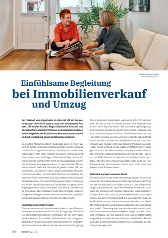 108 67 BEST OF BEST OF Region Biel Portrait xxx Einf%u00fchlsame Begleitung bei Immobilienverkauf und UmzugDer Verkauf vom Eigenheim im Alter ist oft ein herausfordernder und nicht zuletzt auch ein emotionaler Prozess. Die beiden Frauen, Birgit Sch%u00f6nhofen-Knuchel und Cornelia W%u00e4lti, der ERA%u00ae Wohnen im Seeland Immobilien GmbH begleiten die involvierten Personen professionell und mit viel Geduld sowie Einf%u00fchlungsverm%u00f6gen.Viele %u00e4ltere Menschen leben heutzutage allein in ihren H%u00e4usern. In dieser vertrauten Umgebung f%u00fchlen sie sich wohl und zuhause. Doch irgendwann kommt der Zeitpunkt, an dem das Leben allein nicht mehr m%u00f6glich ist und ein Umzug ansteht. Dann stellen sich die Fragen: Wohin jetzt? Was mache ich mit all meinen Sachen? Wer f%u00fchrt die Haus%u00fcbergabe durch? Der Abschied vom eigenen Haus, in dem die betroffenen Menschen oft mehrere Jahrzehnte gelebt haben, f%u00e4llt oft nicht leicht. Die beiden Frauen, Birgit Sch%u00f6nhofen-Knuchel und Cornelia W%u00e4lti, von der ERA%u00ae Wohnen im Seeland Immobilien GmbH k%u00fcmmern sich als professionelle Immobilienberaterinnen mit viel Einf%u00fchlungsverm%u00f6gen, Erfahrung und einem breiten Netzwerk von Fachkr%u00e4ften um genau diese Angelegenheiten. Denn sie wissen: Der Verkauf des Hauses ist emotional, aber trotzdem meist das geringste Problem. Dringendere Fragen m%u00fcssen beantwortet werden, und dabei stehen sie den Betroffenen mit Rat und Tat zur Seite.Im Zentrum steht der MenschDie meisten Hausbesitzenden verkn%u00fcpfen mit dem Zuhause bedeutende Lebensabschnitte und einzigartige Geschichten. Die beiden Immobilien-Fachfrauen von der ERA%u00ae Wohnen im Seeland Immobilien GmbH wissen das und gehen deshalb gerne auf individuelle Anforderungen ein. So gingen sie schon mit einer %u00e4lteren Kundin einen Nachmittag lang Altersresidenzen besichtigen, weil sonst schlicht niemand mehr f%u00fcr sie da war. In einem anderen Fall verstarb eine Kundin ohne Nachkommen. Die n%u00e4chste Angeh%u00f6rige war die Schwester, die allerdings mit ihrer Familie in Mexiko lebt. Auch hier k%u00fcmmerten sich Frau Sch%u00f6nhofen-Knuchel und Frau W%u00e4lti um alles. Zuerst wurde ein Putzinstitut beauftragt, damit das Haus pr%u00e4sentiert werden konnte. Als das Haus verkauft war, musste noch das gesamte Mobiliar raus. Der Fl%u00fcgel wurde verkauft, einige Bilder und M%u00f6bel nach Mexiko geschickt und der Rest entweder ans Antiquariat verkauft oder entsorgt. Selbstverst%u00e4ndlich sorgten die beiden Frauen von der ERA%u00ae Wohnen im Seeland Immobilien GmbH auch daf%u00fcr, dass bei der Schl%u00fcssel%u00fcbergabe alles rund lief. Die Schwester der Verstorbenen musste daf%u00fcr nicht mehr aus Mexiko in die Schweiz reisen.Technisch auf dem neuesten StandAuch technisch ist das Unternehmen top-aktuell. So wird mit moderner Immobilienbewirtschaftungs-Software der Weg von der Kundschaft zum Objekt so rasch und einfach wie m%u00f6glich gew%u00e4hrleistet. %u00dcber die Webseite fi ndet man nicht bloss die derzeitig zum Verkauf stehenden Liegenschaften, sondern kann sich auch als potenzielle K%u00e4uferschaft registrieren. Bei der Anmeldung gibt die interessierte Partei all ihre Pr%u00e4ferenzen ein. Konkret bedeutet das alles, vom Preis, der Art des Objektes und dessen Zustand bis zur Umgebung (und mehr). Diese Angaben werden dann mit den schon in der Datenbank vorhandenen Objekten verglichen. Auch %u00fcber jede Immobilie, die neu publiziert wird und ins Raster passt, kriegt die potenzielle Kundschaft sofort alle Details. Aktuell sind %u00fcber 4000 potenzielle K%u00e4uferinnen und K%u00e4ufer auf der Datenbank registriert!Birgit Sch%u00f6nhofen-Knuchel und Cornelia W%u00e4lti (v. l.)