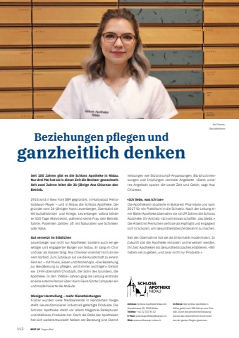 112 59 BEST OF BEST OF Region Biel Portrait xxxAdresse: Schloss Apotheke Nidau AGHauptstrasse 30, 2560 Nidau Telefon: +41 32 331 93 42E-Mail: schlossapotheke@bluewin.chWeb: www.schlossapo-nidau.chIn K%u00fcrze: Die Schloss Apotheke in Nidau geh%u00f6rt seit 100 Jahren zum Ortsbild. Durch die pers%u00f6nliche Beratung konnte das Unternehmen Kund:innen aus der ganzen Region gewinnen.Seit 100 Jahren gibt es die Schloss Apotheke in Nidau. Nur drei Mal hat sie in dieser Zeit die Besitzer gewechselt. Seit zwei Jahren leitet die 31-j%u00e4hrige Ana Chiorean den Betrieb.1924 wird in New York IBM gegr%u00fcndet, in Hollywood MetroGoldwyn-Mayer %u2013 und in Nidau die Schloss Apotheke. Gegr%u00fcndet vom 24-j%u00e4hrigen Hans Leuenberger, %u00fcberstand sie Wirtschaftskrisen und Kriege. Leuenberger selbst leistete 500 Tage Aktivdienst, w%u00e4hrend seine Frau den Betrieb f%u00fchrte. Patienten zahlten oft mit Naturalien wie Schinken oder K%u00e4se.Gut vernetzt im St%u00e4dtchenLeuenberger war nicht nur Apotheker, sondern auch ein geselliger und engagierter B%u00fcrger von Nidau. Er sang im Chor und war als Kassier t%u00e4tig. Ana Chiorean orientiert sich an seinem Vorbild. Zum Jubil%u00e4um lud sie die Kundschaft zu einem Fest ein %u2013 mit Musik, Essen und Workshops. %u00abDie Beziehung zur Bev%u00f6lkerung zu pflegen, wird immer wichtiger%u00bb, betont sie. 1959 %u00fcbernahm Christoph, der Sohn des Gr%u00fcnders, die Apotheke. In den 1980er-Jahren ging die Leitung erstmals an eine externe Person %u00fcber: Karin Favre f%u00fchrte Computer ein und modernisierte die Abl%u00e4ufe.Weniger Herstellung %u2013 mehr DienstleistungenFr%u00fcher wurden viele Medikamente in Handarbeit hergestellt. Heute dominieren industriell gefertigte Produkte. Die Schloss Apotheke stellt vor allem Magistral-Rezepturen und Wellness-Produkte her. Doch die Rolle der Apotheken hat sich weiterentwickelt: Neben der Beratung sind Dienstleistungen wie St%u00fctzstrumpf-Anpassungen, Blutdruckmessungen und Impfungen zentrale Angebote. %u00abDank unseres Angebots sparen die Leute Zeit und Geld%u00bb, sagt Ana Chiorean.%u00abIch liebe, was ich tue%u00bbDie Apothekerin studierte in Bukarest Pharmazie und kam 2017 f%u00fcr ein Praktikum in die Schweiz. Nach der Leitung einer Bieler Apotheke %u00fcbernahm sie mit 29 Jahren die Schloss Apotheke. Ihr Antrieb: %u00abIch will etwas schaffen, das bleibt.%u00bb Die Arbeit mit Menschen sieht sie als Highlight und engagiert sich in Schulen, um Gesundheitsberufe bekannt zu machen.Seit der %u00dcbernahme hat sie die Informatik modernisiert. In Zukunft soll die Apotheke renoviert und erweitert werden. Ihr Ziel: Apotheken als Gesundheitscoaches etablieren. %u00abWir haben viel zu geben, und zwar nicht nur Produkte.%u00bb Beziehungen pfl egen undganzheitlich denkenAna Chiorean, Gesch%u00e4ftsf%u00fchrerin