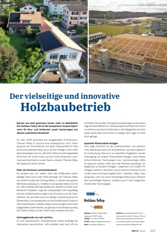 BEST OF Seeland 113BEST OF Portrait xxx 37Der vielseitige und innovative HolzbaubetriebAdresse: Holzbau Telley GmbHS%u00e4geweg 3, 2557 StudenTelefon: +41 78 652 88 05E-Mail: holzbau-telley@outlook.comWeb: www.telley-holzbau.chIn K%u00fcrze: Unser Fachbetrieb f%u00fcr Holzbau besteht seit %u00fcber 15 Jahren. Mit viel Erfahrung verwirklichen wir Ihre Neuund Umbauprojekte sowie Sanierungen mit dem nat%u00fcrlichen Werkstoff Holz.Bauten aus Holz gewinnen immer mehr an Beliebtheit. Die Holzbau Telley AG ist die kompetente Ansprechpartnerin f%u00fcr Neu- und Umbauten sowie Sanierungen aus diesem nat%u00fcrlichen Werkstoff. Im Jahr 2007 gr%u00fcndete der ausgebildete Zimmermann Thomas Telley in Orpund eine Holzbaufi rma. Acht Jahre lang war der Unternehmer mit einer Leidenschaft f%u00fcr Holz als Einmannbetrieb t%u00e4tig, bis er all die Anfragen nicht mehr allein bew%u00e4ltigen konnte. %u00abAb 2015 hatte ich zwei Angestellte, 2019 kam ein dritter hinzu und seit 2024 bereichern nochmals zwei Fachm%u00e4nner unser Team%u00bb, erl%u00e4utert Thomas Telley die Expansion seiner GmbH. Mehr als Zimmerei und DachdeckereiEs versteht sich von selbst, dass das mittlerweile sechsk%u00f6pfi ge Team auch mehr Platz ben%u00f6tigt. Als Thomas Telley von einem Kunden den Auftrag bekam, in Studen eine grosse Werkhalle aufzubauen, mietete er sich gerade selbst dort mit ein. %u00abWir erstellen solch grosse Bauten, widmen uns aber auch kleineren Projekten%u00bb, sagt der Holzspezialist. Die Hauptt%u00e4tigkeit der Holzfachm%u00e4nner liegt in der Zimmerei und der Dachdeckerei. Sie sind aber auch die idealen Ansprechpartner f%u00fcr Elementbau, Innenausbauten und die Erstellung von Carports oder Unterst%u00e4nden. Holzbau Telley ist also ein ganz sch%u00f6n breit aufgestelltes Unternehmen, es gibt kaum eine Arbeit aus Holz, die Thomas Telley und sein Team nicht umsetzen k%u00f6nnten.Auftraggebende von nah und fernEs sind haupts%u00e4chlich Privatpersonen, deren Auftr%u00e4ge die Holzwerker verwirklichen. %u00abWir arbeiten aber auch oft mit Architekturb%u00fcros oder Immobilienverwaltungen zusammen%u00bb, sagt der Gesch%u00e4ftsf%u00fchrer. Die Bauprojekte befi nden sich meist im Umkreis von etwa 15 Kilometern. Die F%u00e4higkeiten der Holzbauer waren aber auch schon im Aargau oder sogar in Frankreich gefragt. Spezielle Photovoltaik-AnlagenDies liegt sicherlich an der professionellen und pers%u00f6nlichen Beratung sowie der kompetenten und termingerechten Umsetzung. Aber auch an speziellen Angeboten wie der Anbringung von Indach-Photovoltaik-Anlagen. Dank dieser fortschrittlichen Technologie kann Sonnenenergie effi zient genutzt werden. Aber auch die %u00c4sthetik %u00fcberzeugt: Im Gegensatz zu Aufdach-Anlagen, integrieren sich Indach-PVAnlagen nahtlos in das Dach, was zu einem schlankeren und moderneren Erscheinungsbild f%u00fchrt. Holzbau Telley %u00fcberzeugt also nicht nur durch jahrelange Erfahrung im Bereich des nachhaltigen Bauens, sondern auch in der Integration modernster Technologien.