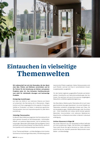 1045 BEST OF BEST OF %u00dcberregional Portrait xxxEintauchen in vielseitige ThemenweltenMit Leidenschaft hat sich die Marmobisa AG den Bereichen Bad, Platten und Wellness verschrieben und ist Ihr Partner f%u00fcr die Umsetzung von kleinen und grossen Projekten jeder Art. Das Schweizer Familienunternehmen steht f%u00fcr individuelle L%u00f6sungen und hochwertige Produkte.Einzigartige AusstellungenAuf mehr als 3000 m%u00b2 und mehreren Ebenen pro Standort pr%u00e4sentiert die Marmobisa%u00a0AG in Ebersecken, Ittigen, Huttwil und Cham angesagte Einrichtungsstile. Eine grosse Vielfalt an Produkten und Ideen in abwechslungsreichen Themenwelten dient als Inspirationsquelle f%u00fcr jede Wohnausstattung.Vielseitige ThemenweltenIm Bereich Bad & Wellness begeistert die Marmobisa%u00a0AG mit einer grossen Auswahl an Sanit%u00e4rapparaten, individuellen M%u00f6beln und weiteren Badprodukten, die f%u00fcr perfekte Erholung sorgen. Besonders %u00fcberzeugen die hauseigenen Granitprodukte wie Granitduschtassen und Waschtische, die durch ihre Qualit%u00e4t und ihr zeitloses Design hervorstechen.In der Themenwelt Boden- und Wandbel%u00e4ge wird ein breites Sortiment an hochwertigem Naturstein, Feinsteinzeug sowie keramischen Platten angeboten. Neben Steinprodukten sind auch Parkett, Laminat und Vinyl in verschiedenen Anwendungsbeispielen ausgestellt.F%u00fcr den Garten erg%u00e4nzen ausgew%u00e4hlte Produkte wie Gartenplatten, Granittische und Natursteinverkleidungen das Sortiment. Sie zeichnen sich durch ihre enorme Langlebigkeit, Robustheit und Witterungsbest%u00e4ndigkeit aus.Die Manufaktur-Abteilung der Marmobisa%u00a0AG ist auf massgeschneiderte L%u00f6sungen spezialisiert. Aus einer Vielzahl von Materialien entstehen einzigartige Unikate nach Mass. Ob K%u00fcchenabdeckungen, M%u00f6belverkleidungen oder Duschtassen %u2013 Ihrer Kreativit%u00e4t sind nahezu keine Grenzen gesetzt. Besonders hervorzuheben sind exklusive Badewannen, Waschtische und Badezimmerm%u00f6bel im Bereich Individualanfertigung.Sch%u00f6ner Showroom in Ittigen BENur einen Steinwurf von der Hauptstadt entfernt befi ndet sich die Ausstellung in Ittigen. Das famili%u00e4re und engagierte Team steht Ihnen dort gerne beratend zur Seite und unterst%u00fctzt Sie bei der Auswahl passender Badprodukte sowie Boden- und Wandbel%u00e4ge.