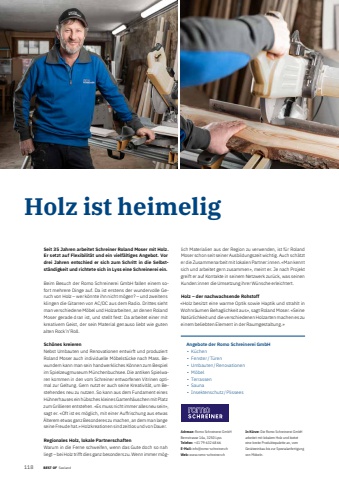 118 54 BEST OF BEST OF Seeland Portrait xxxHolz ist heimeligAdresse: Romo Schreinerei GmbH Bernstrasse 14a, 3250 LyssTelefon: +41 79 632 68 66E-Mail: info@romo-schreiner.chWeb: www.romo-schreiner.chIn K%u00fcrze: Die Romo Schreinerei GmbH arbeitet mit lokalem Holz und bietet eine breite Produktepalette an, vom Ger%u00e4teeinbau bis zur Spezialanfertigung von M%u00f6beln.Seit 35 Jahren arbeitet Schreiner Roland Moser mit Holz. Er setzt auf Flexibilit%u00e4t und ein vielf%u00e4ltiges Angebot. Vor drei Jahren entschied er sich zum Schritt in die Selbstst%u00e4ndigkeit und richtete sich in Lyss eine Schreinerei ein.Beim Besuch der Romo Schreinerei GmbH fallen einem sofort mehrere Dinge auf. Da ist erstens der wundervolle Geruch von Holz %u2013 wer k%u00f6nnte ihn nicht m%u00f6gen? %u2013 und zweitens klingen die Gitarren von AC/DC aus dem Radio. Drittes sieht man verschiedene M%u00f6bel und Holzarbeiten, an denen Roland Moser gerade dran ist, und stellt fest: Da arbeitet einer mit kreativem Geist, der sein Material genauso liebt wie guten alten Rock%u2019n%u2019Roll.Sch%u00f6nes kreierenNebst Umbauten und Renovationen entwirft und produziert Roland Moser auch individuelle M%u00f6belst%u00fccke nach Mass. Bewundern kann man sein handwerkliches K%u00f6nnen zum Bespiel im Spielzeugmuseum M%u00fcnchenbuchsee. Die antiken Spielwaren kommen in den vom Schreiner entworfenen Vitrinen optimal zur Geltung. Gern nutzt er auch seine Kreativit%u00e4t, um Bestehendes neu zu nutzen. So kann aus dem Fundament eines H%u00fchnerhauses ein h%u00fcbsches kleines Gartenh%u00e4uschen mit Platz zum Grillieren entstehen. %u00abEs muss nicht immer alles neu sein%u00bb, sagt er. %u00abOft ist es m%u00f6glich, mit einer Auffrischung aus etwas %u00c4lterem etwas ganz Besonderes zu machen, an dem man lange seine Freude hat.%u00bb Holzkreationen sind zeitlos und von Dauer.Regionales Holz, lokale PartnerschaftenWarum in die Ferne schweifen, wenn das Gute doch so nah liegt %u2013 bei Holz trifft dies ganz besonders zu. Wenn immer m%u00f6glich Materialien aus der Region zu verwenden, ist f%u00fcr Roland Moser schon seit seiner Ausbildungszeit wichtig. Auch sch%u00e4tzt er die Zusammenarbeit mit lokalen Partner:innen. %u00abMan kennt sich und arbeitet gern zusammen%u00bb, meint er. Je nach Projekt greift er auf Kontakte in seinem Netzwerk zur%u00fcck, was seinen Kunden:innen die Umsetzung ihrer W%u00fcnsche erleichtert. Holz %u2013 der nachwachsende Rohstoff%u00abHolz besitzt eine warme Optik sowie Haptik und strahlt in Wohnr%u00e4umen Behaglichkeit aus%u00bb, sagt Roland Moser. %u00abSeine Nat%u00fcrlichkeit und die verschiedenen Holzarten machen es zu einem beliebten Element in der Raumgestaltung.%u00bbAngebote der Romo Schreinerei GmbH%u2022 K%u00fcchen%u2022 Fenster / T%u00fcren%u2022 Umbauten / Renovationen%u2022 M%u00f6bel%u2022 Terrassen%u2022 Sauna%u2022 Insektenschutz / Plissees