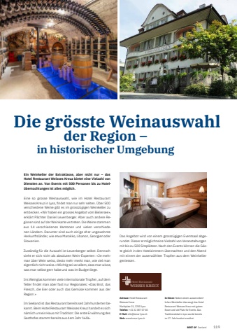 BEST OF BEST OFPortrait xxx Seeland 11942Die gr%u00f6sste Weinauswahl der Region %u2013 in historischer UmgebungHotel RestaurantWEISSES KREUZAdresse: Hotel Restaurant Weisses KreuzMarktplatz 15, 3250 LyssTelefon: +41 32 387 07 40E-Mail: info@kreuz-lyss.chWeb: www.kreuz-lyss.chIn K%u00fcrze: Neben einem ausserordentlichen Weinkeller %u00fcberzeugt das Hotel Restaurant Weisses Kreuz mit gutem Essen und viel Platz f%u00fcr Events. Das Traditionslokal in Lyss wurde bereits im 17. Jahrhundert erw%u00e4hnt.Ein Weinkeller der Extraklasse, aber nicht nur %u2013 das Hotel Restaurant Weisses Kreuz bietet eine Vielzahl von Diensten an. Von Events mit 500 Personen bis zu Hotel%u00fcbernachtungen ist alles m%u00f6glich. Eine so grosse Weinauswahl, wie im Hotel Restaurant Weisses Kreuz in Lyss, fi ndet man nur sehr selten. %u00dcber 500 verschiedene Weine gibt es im grossz%u00fcgigen Weinkeller zu entdecken. %u00abWir haben ein grosses Angebot vom Bielersee%u00bb, erkl%u00e4rt P%u00e4chter Daniel Leuenberger. Aber auch andere Regionen sind auf der Weinkarte vertreten. Die Weine stammen aus 14 verschiedenen Kantonen und vielen verschiedenen L%u00e4ndern. Darunter sind auch einige eher ungewohnte Herkunftsl%u00e4nder, wie etwa Marokko, Libanon, Georgien oder Slowenien. Zust%u00e4ndig f%u00fcr die Auswahl ist Leuenberger selbst. Dennoch sieht er sich nicht als absoluten Wein-Experten: %u00abJe mehr man %u00fcber Wein weiss, desto mehr merkt man, wie viel man eigentlich nicht weiss.%u00bb Wichtig sei vor allem, dass man wisse, was man selbst gern habe und was im Budget liege. Ins Weinglas kommen viele internationale Tropfen, auf dem Teller fi ndet man aber fast nur Regionales: %u00abDas Brot, das Fleisch, die Eier oder auch das Gem%u00fcse kommen aus der Region.%u00bb Im Seeland ist das Restaurant bereits seit Jahrhunderten bekannt. Beim Hotel Restaurant Weisses Kreuz handelt es sich n%u00e4mlich um ein Haus mit Tradition: Die erste Erw%u00e4hnung des Gasthofes stammt bereits aus dem Jahr 1606. Das Angebot wird von einem grossz%u00fcgigen Eventsaal abgerundet. Dieser erm%u00f6glicht eine Vielzahl von Veranstaltungen mit bis zu 500 Sitzpl%u00e4tzen. Nach den Events k%u00f6nnen die G%u00e4ste gleich in den Hotelzimmern %u00fcbernachten und den Abend mit einem der auserw%u00e4hlten Tropfen aus dem Weinkeller geniessen.