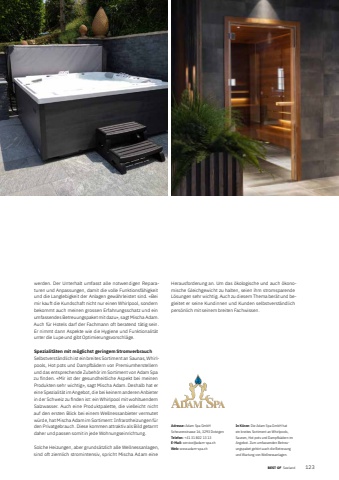 BEST OF BEST OFPortrait xxx Seeland 1232Adresse: Adam Spa GmbHScheurenstrasse 16, 3293 DotzigenTelefon: +41 31 802 13 13E-Mail: service@adam-spa.chWeb: www.adam-spa.chIn K%u00fcrze: Die Adam Spa GmbH hat ein breites Sortiment an Whirlpools, Saunen, Hot pots und Dampfb%u00e4dern im Angebot. Zum umfassenden Betreuungspaket geh%u00f6rt auch die Betreuung und Wartung von Wellnessanlagen.werden. Der Unterhalt umfasst alle notwendigen Reparaturen und Anpassungen, damit die volle Funktionsf%u00e4higkeit und die Langlebigkeit der Anlagen gew%u00e4hrleistet sind. %u00abBei mir kauft die Kundschaft nicht nur einen Whirlpool, sondern bekommt auch meinen grossen Erfahrungsschatz und ein umfassendes Betreuungspaket mit dazu%u00bb, sagt Mischa Adam. Auch f%u00fcr Hotels darf der Fachmann oft beratend t%u00e4tig sein. Er nimmt dann Aspekte wie die Hygiene und Funktionalit%u00e4t unter die Lupe und gibt Optimierungsvorschl%u00e4ge. Spezialit%u00e4ten mit m%u00f6glichst geringem StromverbrauchSelbstverst%u00e4ndlich ist ein breites Sortiment an Saunas, Whirlpools, Hot pots und Dampfb%u00e4dern von Premiumherstellern und das entsprechende Zubeh%u00f6r im Sortiment von Adam Spa zu fi nden. %u00abMir ist der gesundheitliche Aspekt bei meinen Produkten sehr wichtig%u00bb, sagt Mischa Adam. Deshalb hat er eine Spezialit%u00e4t im Angebot, die bei keinem anderen Anbieter in der Schweiz zu fi nden ist: ein Whirlpool mit wohltuendem Salzwasser. Auch eine Produktpalette, die vielleicht nicht auf den ersten Blick bei einem Wellnessanbieter vermutet w%u00fcrde, hat Mischa Adam im Sortiment: Infrarotheizungen f%u00fcr den Privatgebrauch. Diese kommen attraktiv als Bild getarnt daher und passen somit in jede Wohnungseinrichtung. Solche Heizungen, aber grunds%u00e4tzlich alle Wellnessanlagen, sind oft ziemlich stromintensiv, spricht Mischa Adam eine Herausforderung an. Um das %u00f6kologische und auch %u00f6konomische Gleichgewicht zu halten, seien ihm stromsparende L%u00f6sungen sehr wichtig. Auch zu diesem Thema ber%u00e4t und begleitet er seine Kundinnen und Kunden selbstverst%u00e4ndlich pers%u00f6nlich mit seinem breiten Fachwissen.