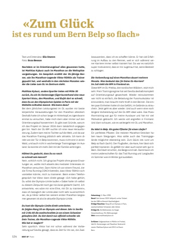 126 BEST OF BEST OF PromiText und Intervie Elio StammFoto: Enzo BessonNachdem er im Orientierungslauf alles gewonnen hatte, ist Matthias Kyburz auch im Marathon an die Weltspitze vorgedrungen. Im Gespr%u00e4ch erz%u00e4hlt der 35-j%u00e4hrige Berner, wie ihn Marathon-Legende Viktor R%u00f6thlin als Trainer gepusht hat, und weshalb in den n%u00e4chsten Monaten wieder die Liebe zum OL im Zentrum steht.Matthias Kyburz, andere Sportler treten mit Mitte 30 zur%u00fcck, Du als OL-Seriensieger f%u00fcgst kurzerhand eine neue Sportart hinzu, den Marathon, und l%u00e4ufst dort so schnell, dass Du an den Olympischen Spielen in Paris mit der Weltelite mithalten kannst. Wie kams dazu?Bei dem j%u00e4hrlichen Leistungstest im OL wurden mir beste k%u00f6rperliche Voraussetzungen f%u00fcr den Marathon attestiert. Deshalb hatte ich schon lange im Hinterkopf, es irgendwann einmal zu versuchen, habe mich dann aber immer auf den Orientierungslauf konzentriert. Es gibt zwei Gr%u00fcnde, warum ich das Projekt im Januar 2024 dann tats%u00e4chlich angegangen bin. Nach der OL-WM suchte ich eine neue Herausforderung. Zudem kam meine Tochter auf die Welt, und da war das Marathon-Training pl%u00f6tzlich sehr attraktiv. Ich kann direkt von der T%u00fcr in Belp losrennen, muss nicht erst in einen Wald, und auch nicht in wochenlange Trainingslager im Ausland. So konnte ich mehr Zeit mit der Familie verbringen.H%u00e4ttest Du gedacht, dass Du so rasch so schnell sein kannst?Nein, wirklich nicht. Ich ging das Projekt ohne grosse Erwartungen an, wollte mich abseits des medialen Interesses im Marathon versuchen. Dann h%u00f6rte ich von einem Freund, der die Firma Running.COACH betreibt, dass Viktor R%u00f6thlin sich vorstellen k%u00f6nnte, mich zu trainieren. Beim ersten Telefongespr%u00e4ch hat Viktor dann direkt gesagt: %u00abIch habe geh%u00f6rt, Du willst die Olympia-Limite laufen.%u00bb Dabei hatte ich selbst zu diesem Zeitpunkt noch gar nie daran gedacht (lacht). Ich antwortete, %u00abes w%u00e4re mir eine Ehre, mit Dir zu trainieren%u00bb, dass ich bez%u00fcglich der Limite aber nicht sehr zuversichtlich sei, da ja Viktor selbst bei seinem ersten Marathon langsamer gewesen ist als die aktuelle Olympia-Limite. Du hast die Olympia-Limite direkt unterboten. Es folgten Rang 30 an Olympia und dieses Jahr in Sevilla mit 2:06:48 die zweitschnellste je von einem Schweizer gelaufene Zeit. Du bist damit nun offi ziell schneller als Dein Trainer, die Marathon-Legende Viktor R%u00f6thlin. Wie hat er reagiert?Sehr sportlich. Viktor hat mir schon w%u00e4hrend der Vorbereitung auf Sevilla gesagt, dass es Zeit f%u00fcr ihn sei, die Zwei loszuwerden, dass ich es schaffen k%u00f6nne. Er hat viel Erfahrung im Aufbau zu den Rennen, weil er sich w%u00e4hrend seiner Karriere immer selbst trainiert hat. Da war es nat%u00fcrlich super motivierend, dass er mir zugetraut hat, seine Bestzeit zu schlagen. Die Vorbereitung auf einen Marathon dauert mehrere Monate. Was bedeutet das f%u00fcr Deine OL-Karriere? Im Juli steht die WM in Finnland an.Diese WM im OL-Mekka, den nordischen W%u00e4ldern, reizt mich sehr. Mein Trainingsregime hat seit Sevilla deshalb komplett auf Orientierungslauf gewechselt. Wieder reinzukommen war nicht so einfach, die Belastung der Fussmuskulatur ist eine andere, man braucht mehr Kraft in den Beinen. Die ersten paar Einheiten hatte ich das Gef%u00fchl, im Gel%u00e4nde zu straucheln. Jetzt geht es aber wieder. Und auch wenn eine noch l%u00e4ngere Vorbereitung auf die OL-WM ideal w%u00e4re. Das Marathontraining war gut f%u00fcr meine Ausdauer und hat mir viel Motivation gebracht. Ich werde voll angreifen in Finnland. Und dann schauen, wie es weitergeht mit OL und Marathon.Du lebst in Belp. Ein gutes Pflaster f%u00fcr einen L%u00e4ufer? Ein perfektes Pflaster. Die meisten Marathon-Strecken haben kaum Steigungen. Also sollte auch das Trainingsgel%u00e4nde m%u00f6glichst ebenerdig sein. Zum Gl%u00fcck ists rund um Belp so flach (lacht). Der Flughafen, die Aare, hier l%u00e4sst sich perfekt trainieren. Es gef%u00e4llt mir aber auch sonst sehr gut in Bern. Die Stadt ist sch%u00f6n, die Berge sind nah. Damit kann ich meine Leidenschaften f%u00fcr das Trail Running und Langlaufen im Sommer wie im Winter gut ausleben.Geburtstag: 5. M%u00e4rz 1990Beruf: Seit Januar 2025 Vollprofi , vorher Teilzeit bei der SBB im Bereich NachhaltigkeitErfolge Marathon: Rang 30 an Olympia in Paris, zweitschnellster Schweizer aller ZeitenErfolge OL: 8x Weltmeister, 6x Sieger Gesamtweltcup, 25x WeltcupsiegerWeb: www.matthiaskyburz.ch In K%u00fcrze: Aufgewachsen in M%u00f6hlin im Fricktal, lebt OL-Seriensieger und Marathon-Senkrechtstarter Matthias Kyburz seit 2013 im Raum Bern. %u00abZum Gl%u00fcckist es rund um Bern Belp so fl ach%u00bb