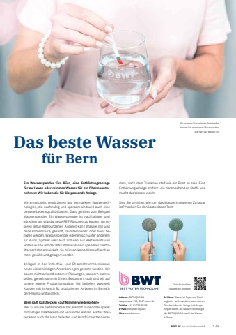 BEST OF Aus der Nachbarschaft BEST OF Portrait xxx 1293Das beste Wasser f%u00fcr BernAdresse: BWT AQUA AGHauptstrasse 192, 4147 Aesch BLTelefon: +41 61 755 88 99E-Mail: info@bwt-aqua.chWeb: www.bwt.comIn K%u00fcrze: Wasser ist Segen und Fluch zugleich %u2013 und zwar dann, wenn sich an Duschw%u00e4nden etc. l%u00e4stige Kalkablagerungen bilden. Die Wasser-Technologie der BWT AQUA AG macht das Wasser kalkarm.Ein Wasserspender f%u00fcrs B%u00fcro, eine Enth%u00e4rtungsanlage f%u00fcr zu Hause oder reinstes Wasser f%u00fcr ein Pharmaunternehmen: Wir haben die f%u00fcr Sie passende Anlage.Wir entwickeln, produzieren und vermarkten Wassertechnologien, die nachhaltig und sparsam sind und auch eine bessere Lebensqualit%u00e4t bieten. Dazu geh%u00f6ren zum Beispiel Wasserspender. Ein Wasserspender ist nachhaltiger und g%u00fcnstiger als st%u00e4ndig neue PET-Flaschen zu kaufen. An unseren leitungsgebundenen Anlagen kann Wasser mit und ohne Kohlens%u00e4ure, gek%u00fchlt, raumtemperiert oder heiss bezogen werden. Wasserspender eigenen sich unter anderem f%u00fcr B%u00fcros, Spit%u00e4ler oder auch Schulen. F%u00fcr Restaurants und Hotels wurde mit der BWT WasserBar ein spezieller GastroWasserhahn entwickelt. So m%u00fcssen keine Wasserflaschen mehr gek%u00fchlt und gelagert werden. Anlagen in der Industrie- und Pharmabranche m%u00fcssen heute vielschichtigen Anforderungen gerecht werden. Wir bauen nicht anhand externer Planungen, sondern planen selbst, gemeinsam mit Ihnen. Besonders stolz sind wir auf unsere eigene Produktionsst%u00e4tte. Wir beliefern weltweit Kunden mit in Aesch BL produzierten Anlagen im Bereich der Pharma und Biotech.Bern sagt Kalkflecken %u00abauf Nimmerwiedersehen%u00bbWer zu Hause hartes Wasser hat, k%u00e4mpft fr%u00fcher oder sp%u00e4ter mit l%u00e4stigen Kalkflecken und verkalkten Rohren. Hartes Wasser kann auch die Haut belasten und Handt%u00fccher tendie ren dazu, nach dem Trocknen steif wie ein Brett zu sein. Eine Enth%u00e4rtungsanlage entfernt die hartmachenden Stoffe und macht das Wasser weich. Sind Sie unsicher, wie hart das Wasser im eigenen Zuhause ist? Machen Sie den kostenlosen Test!Mit unserem Wasserh%u00e4rte-Teststreifen k%u00f6nnen Sie innert einer Minute testen, wie hart das Wasser ist.Jetzt kostenlosen Teststreifen anfordern