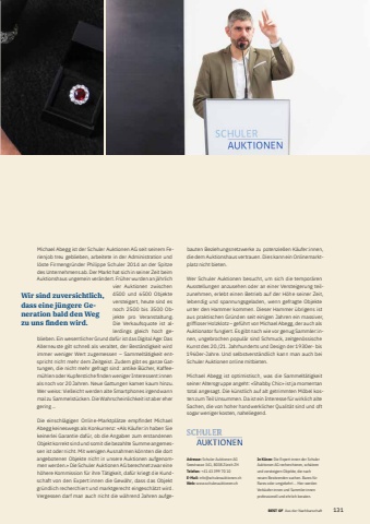 BEST OF Aus der Nachbarschaft 131Adresse: Schuler Auktionen AGSeestrasse 341, 8038 Z%u00fcrich ZHTelefon: +41 43 399 70 10E-Mail: info@schulerauktionen.chWeb: www.schulerauktionen.chIn K%u00fcrze: Die Expert:innen der Schuler Auktionen AG recherchieren, sch%u00e4tzen und versteigern Objekte, die nach neuen Besitzenden suchen. Bares f%u00fcr Rares oder umgekehrt %u2026 Hier werden Verk%u00e4ufer:innen und Sammler:innen professionell und ehrlich beraten.Michael Abegg ist der Schuler Auktionen AG seit seinem Ferienjob treu geblieben, arbeitete in der Administration und l%u00f6ste Firmengr%u00fcnder Philippe Schuler 2014 an der Spitze des Unternehmens ab. Der Markt hat sich in seiner Zeit beim Auktionshaus ungemein ver%u00e4ndert. Fr%u00fcher wurden an j%u00e4hrlich vier Auktionen zwischen 4500 und 6500 Objekte versteigert, heute sind es noch 2500 bis 3500 Objekte pro Veranstaltung. Die Verkaufsquote ist allerdings gleich hoch geblieben. Ein wesentlicher Grund daf%u00fcr ist das Digital Age: Das Allerneuste gilt schnell als veraltet, der Best%u00e4ndigkeit wird immer weniger Wert zugemessen %u2013 Sammelt%u00e4tigkeit entspricht nicht mehr dem Zeitgeist. Zudem gibt es ganze Gattungen, die nicht mehr gefragt sind: antike B%u00fccher, Kaffeem%u00fchlen oder Kupferstiche fi nden weniger Interessent:innen als noch vor 20 Jahren. Neue Gattungen kamen kaum hinzu. Wer weiss: Vielleicht werden alte Smartphones irgendwann mal zu Sammelst%u00fccken. Die Wahrscheinlichkeit ist aber eher gering %u2026 Die einschl%u00e4gigen Online-Marktpl%u00e4tze empfi ndet Michael Abegg keineswegs als Konkurrenz: %u00abAls K%u00e4ufer:in haben Sie keinerlei Garantie daf%u00fcr, ob die Angaben zum erstandenen Objekt korrekt sind und somit die bezahlte Summe angemessen ist oder nicht. Mit wenigen Ausnahmen k%u00f6nnten die dort angebotenen Objekte nicht in unsere Auktionen aufgenommen werden.%u00bb Die Schuler Auktionen AG berechnet zwar eine h%u00f6here Kommission f%u00fcr ihre T%u00e4tigkeit, daf%u00fcr kriegt die Kundschaft von den Expert:innen die Gew%u00e4hr, dass das Objekt gr%u00fcndlich recherchiert und marktgerecht eingesch%u00e4tzt wird. Vergessen darf man auch nicht die w%u00e4hrend Jahren aufgebauten Beziehungsnetzwerke zu potenziellen K%u00e4ufer:innen, die dem Auktionshaus vertrauen. Dies kann ein Onlinemarktplatz nicht bieten. Wer Schuler Auktionen besucht, um sich die tempor%u00e4ren Ausstellungen anzusehen oder an einer Versteigerung teilzunehmen, erlebt einen Betrieb auf der H%u00f6he seiner Zeit, lebendig und spannungsgeladen, wenn gefragte Objekte unter den Hammer kommen. Dieser Hammer %u00fcbrigens ist aus praktischen Gr%u00fcnden seit einigen Jahren ein massiver, griffloser Holzklotz %u2013 gef%u00fchrt von Michael Abegg, der auch als Auktionator fungiert. Es gibt nach wie vor genug Sammler:innen, ungebrochen popul%u00e4r sind Schmuck, zeitgen%u00f6ssische Kunst des 20./21. Jahrhunderts und Design der 1930er- bis 1960er-Jahre. Und selbstverst%u00e4ndlich kann man auch bei Schuler Auktionen online mitbieten. Michael Abegg ist optimistisch, was die Sammelt%u00e4tigkeit seiner Altersgruppe angeht: %u00abShabby Chic%u00bb ist ja momentan total angesagt. Die k%u00fcnstlich auf alt getrimmten M%u00f6bel kosten zum Teil Unsummen. Da ist ein Interesse f%u00fcr wirklich alte Sachen, die von hoher handwerklicher Qualit%u00e4t sind und oft sogar weniger kosten, naheliegend. Wir sind zuversichtlich, dass eine j%u00fcngere Generation bald den Weg zu uns fi nden wird.BEST OF Portrait xxx 58