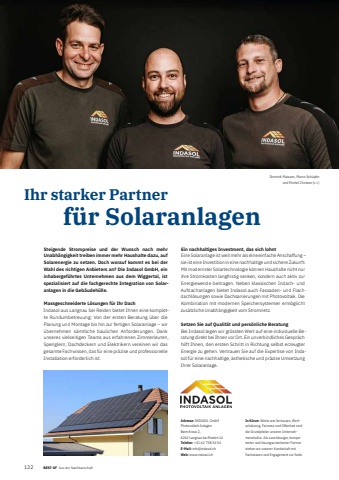 132 38 BEST OF BEST OF Aus der Nachbarschaft Portrait xxxIhr starker Partner f%u00fcr SolaranlagenAdresse: INDASOL GmbHPhotovoltaik AnlagenBeim Kreuz 2, 6262 Langnau bei Reiden LUTelefon: +41 62 758 54 54E-Mail: info@indasol.chWeb: www.indasol.chIn K%u00fcrze: Werte wie Vertrauen, Wertsch%u00e4tzung, Fairness und Offenheit sind die Grundpfeiler unserer Unternehmenskultur. Als zuverl%u00e4ssiger, kompetenter und l%u00f6sungsorientierter Partner stehen wir unserer Kundschaft mit Fachwissen und Engagement zur Seite.Steigende Strompreise und der Wunsch nach mehr Unab h%u00e4ngigkeit treiben immer mehr Haushalte dazu, auf Solarenergie zu setzen. Doch worauf kommt es bei der Wahl des richtigen Anbieters an? Die Indasol GmbH, ein inhabergef%u00fchrtes Unternehmen aus dem Wiggertal, ist spezialisiert auf die fachgerechte Integration von Solaranlagen in die Geb%u00e4udeh%u00fclle.Massgeschneiderte L%u00f6sungen f%u00fcr Ihr Dach Indasol aus Langnau bei Reiden bietet Ihnen eine komplette Rundumbetreuung: Von der ersten Beratung %u00fcber die Planung und Montage bis hin zur fertigen Solaranlage %u2013 wir %u00fcbernehmen s%u00e4mtliche baulichen Anforderungen. Dank unseres vielseitigen Teams aus erfahrenen Zimmerleuten, Spenglern, Dachdeckern und Elektrikern vereinen wir das gesamte Fachwissen, das f%u00fcr eine pr%u00e4zise und professionelle Installation erforderlich ist.Ein nachhaltiges Investment, das sich lohntEine Solaranlage ist weit mehr als eine einfache Anschaffung %u2013 sie ist eine Investition in eine nachhaltige und sichere Zukunft. Mit modernster Solartechnologie k%u00f6nnen Haus halte nicht nur ihre Stromkosten langfristig senken, sondern auch aktiv zur Energiewende beitragen. Neben klassischen Indach- und Aufdachanlagen bietet Indasol auch Fassaden- und Flachdachl%u00f6sungen sowie Dachsanierungen mit Photovoltaik. Die Kombination mit modernen Speichersystemen erm%u00f6glicht zus%u00e4tzliche Unabh%u00e4ngigkeit vom Stromnetz.Setzen Sie auf Qualit%u00e4t und pers%u00f6nliche BeratungBei Indasol legen wir gr%u00f6ssten Wert auf eine individuelle Beratung direkt bei Ihnen vor Ort. Ein unverbindliches Gespr%u00e4ch hilft Ihnen, den ersten Schritt in Richtung selbst erzeugter Energie zu gehen. Vertrauen Sie auf die Expertise von Indasol f%u00fcr eine nachhaltige, %u00e4sthetische und pr%u00e4zise Umsetzung Ihrer Solaranlage.Dominik Maissen, Marco Sch%u00fcpfer und Michel Christen (v. l.)
