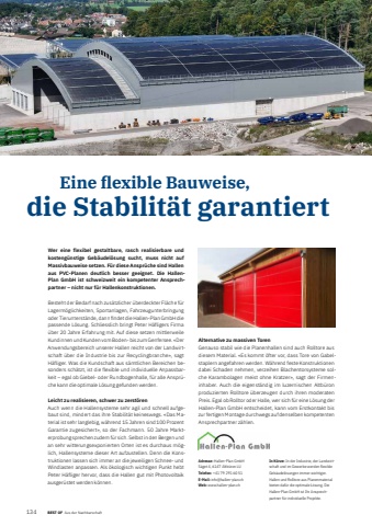 134 32 BEST OF BEST OF Aus der Nachbarschaft Portrait xxx Eine fl exible Bauweise,die Stabilit%u00e4t garantiertAdresse: Hallen-Plan GmbHS%u00e4get 4, 6147 Altb%u00fcron LUTelefon: +41 79 291 60 51E-Mail: info@hallen-plan.chWeb: www.hallen-plan.chIn K%u00fcrze: In der Industrie, der Landwirtschaft und im Gewerbe werden flexible Geb%u00e4udel%u00f6sungen immer wichtiger. Hallen und Rolltore aus Planenmaterial bieten daf%u00fcr die optimale L%u00f6sung. Die Hallen-Plan GmbH ist Ihr Ansprechpartner f%u00fcr individuelle Projekte.Wer eine flexibel gestaltbare, rasch realisierbare und kosteng%u00fcnstige Geb%u00e4udel%u00f6sung sucht, muss nicht auf Massivbauweise setzen. F%u00fcr diese Anspr%u00fcche sind Hallen aus PVC-Planen deutlich besser geeignet. Die HallenPlan GmbH ist schweizweit ein kompetenter Ansprechpartner %u2013 nicht nur f%u00fcr Hallenkonstruktionen.Besteht der Bedarf nach zus%u00e4tzlicher %u00fcberdeckter Fl%u00e4che f%u00fcr Lagerm%u00f6glichkeiten, Sportanlagen, Fahrzeugunterbringung oder Tierunterst%u00e4nde, dann fi ndet die Hallen-Plan GmbH die passende L%u00f6sung. Schliesslich bringt Peter H%u00e4fligers Firma %u00fcber 20 Jahre Erfahrung mit. Auf diese setzen mittlerweile Kundinnen und Kunden vom Boden- bis zum Genfersee. %u00abDer Anwendungsbereich unserer Hallen reicht von der Landwirtschaft %u00fcber die Industrie bis zur Recyclingbranche%u00bb, sagt H%u00e4fliger. Was die Kundschaft aus s%u00e4mtlichen Bereichen besonders sch%u00e4tzt, ist die flexible und individuelle Anpassbarkeit %u2013 egal ob Giebel- oder Rundbogenhalle, f%u00fcr alle Anspr%u00fcche kann die optimale L%u00f6sung gefunden werden. Leicht zu realisieren, schwer zu zerst%u00f6renAuch wenn die Hallensysteme sehr agil und schnell aufgebaut sind, mindert das ihre Stabilit%u00e4t keineswegs. %u00abDas Material ist sehr langlebig, w%u00e4hrend 15 Jahren sind 100 Prozent Garantie zugesichert%u00bb, so der Fachmann. 50 Jahre Markterprobung sprechen zudem f%u00fcr sich. Selbst in den Bergen und an sehr witterungsexponierten Orten ist es durchaus m%u00f6glich, Hallensysteme dieser Art aufzustellen. Denn die Konstruktionen lassen sich immer an die jeweiligen Schnee- und Windlasten anpassen. Als %u00f6kologisch wichtigen Punkt hebt Peter H%u00e4fliger hervor, dass die Hallen gut mit Photovoltaik ausger%u00fcstet werden k%u00f6nnen.Alternative zu massiven TorenGenauso stabil wie die Planenhallen sind auch Rolltore aus diesem Material. %u00abEs kommt %u00f6fter vor, dass Tore von Gabelstaplern angefahren werden. W%u00e4hrend feste Konstruktionen dabei Schaden nehmen, verzeihen Blachentorsysteme solche Karambolagen meist ohne Kratzer%u00bb, sagt der Firmeninhaber. Auch die eigenst%u00e4ndig im luzernischen Altb%u00fcron produzierten Rolltore %u00fcberzeugen durch ihren moderaten Preis. Egal ob Rolltor oder Halle, wer sich f%u00fcr eine L%u00f6sung der Hallen-Plan GmbH entscheidet, kann vom Erstkontakt bis zur fertigen Montage durchwegs auf denselben kompetenten Ansprechpartner z%u00e4hlen.
