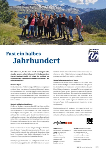 BEST OF Aus der Nachbarschaft BEST OF Portrait xxx 1352Wir sehen was, das Du nicht siehst. Und sorgen daf%u00fcr, dass Du gesehen wirst. Bei uns wirkt Werbung anders: Frontal. Regional. Genial. Mit Inhalt, der am%u00fcsiert, inspiriert und Dein Zielpublikum messerscharf avisiert. Na, schon interessiert?Wir sind MiplanDie Symbiose aus Medienverlag und Miplanpower gepaart mit dem Know-how unserer kreativen K%u00f6pfe macht unsere Einzigartigkeit aus. Als unabh%u00e4ngiges Schweizer Medienunternehmen produzieren wir seit 45%u00a0Jahren qualitativ hochstehende Produkte in den Bereichen Online, Print medien und kartografi sche F%u00fchrsysteme. Wir bringen Deine Kommunikation ins Rollen.Hautnah bei Deinen Kund:innenMit Deiner Werbung in unseren %u00fcber 20%u00a0Produkten erreichst Du tausende Einwoh ner:innen im deutschsprachigen Raum. Von wegen %u00abPrint ist out%u00bb: Das BEST OF, unser Flaggschiff, beweist genau das Gegenteil. Von A wie Architektin bis Z wie Zahnarzt: Bei uns ist die ganze Bandbreite an Unternehmen und Branchen vertreten. Und so funktionierts: Journalistisch recher chiert und eingebunden ins Hochglanz-Paket wird Dein Firmenportr%u00e4t im ganzen Kanton unter die Leute gebracht. Genau dorthin, wo es gesehen werden soll. Unser zweites Produkt ist das Hochglanzmagazin Meine Region. Ein bunter Mix aus Beitr%u00e4gen zu aktuellen Themen sowie Trends und Portr%u00e4ts, die das pulsierende Gewerbe und das bunte Vereinsleben in der Region widerspiegeln, bringt Vertrauen und Zusammenhalt in die jeweilige Region.Der Ursprung: unsere Orts- und Stadtpl%u00e4ne in Form von laminierten Aushangpl%u00e4nen. Im Jahr 2023 haben wir unsere Produkte einem Relaunch mit neuem Inhaltskonzept und diverseren Sales-M%u00f6glichkeiten unterzogen. In diesem Zuge entstand auch die Marke %u00abmeine-region.ch%u00bb.Werde Teil eines engagierten TeamsDie Heimat der Miplan liegt in H%u00e4gendorf im Kanton Solothurn. Wir besch%u00e4ftigen %u00fcber 40 Mitarbeitende in der gesamten Deutschschweiz in %u00fcber zehn unterschiedlichen Berufen. Ein:e Miplaner:in zu sein, bedeutet Teil eines engagierten, motivierten Teams zu sein. Gemeinsam feiern wir Erfolge und haben jede Menge Spass. Bei uns arbeiten sowohl j%u00fcngere als auch %u00e4ltere Generationen t%u00e4glich eng zusammen. Jeder kann von jedem lernen und gemeinsam bilden wir ein tolles Team. Wir wurden als Arbeitgeberin mit dem kununu %u00abTOP Company Award 2025%u00bb ausgezeichnet. Darauf sind wir besonders stolz.Die Medienlandschaft ver%u00e4ndert sich rasend schnell. Um Schritt zu halten, braucht es einen starken Motor: engagierte Mitarbeitende! Du willst Teil des Teams werden? Informiere dich jetzt auf miplan.ch/jobs %u00fcber unsere offenen Stellen.Fast ein halbes JahrhundertAdresse: Miplan AGFabrikstrasse 10, 4614 H%u00e4gendorf SOTelefon: +41 62 210 10 10E-Mail: info@miplan.chWeb: www.miplan.ch, www.best-of-magazin.ch, www.golocal.swissFacebook: miplan.ag.chLinkedIn: miplan-agIn K%u00fcrze: Wir bringen Deine Kommunikation ins Rollen! Die Miplan AG sorgt seit 45 Jahren daf%u00fcr, dass Du an strategisch ausgesuchten Stellen pr%u00e4sent bist. Local Power mit Zeitschriften, Kartografi e und Onlinemedien. Unser Erfolgskonzept heisst Zuverl%u00e4ssigkeit.CMYCMMYCYCMYKkununu_TopCompanyBadge_2025_CMYK Kopie.pdf 1 10.06.24 11:16