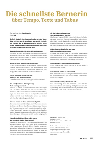 BEST OF BEST OF Promi 1392Text und Intervie Rahel HegglinFoto: SRFStefanie Grob gilt als %u00abdie schnellste Bernerin der Welt%u00bb. Dies, weil ihre %u00abwords per minute%u00bb fast so viele sind, wie bei Eminem. Sie ist B%u00fchnenk%u00fcnstlerin, schreibt Satire, Prosa, Theaterst%u00fccke und Kabarettnummern und w%u00fcrde sich nie in ein Bad voller Spinnen legen. Sie sind %u00abSpoken-Word-Artistin%u00bb. Wie wird man das? Ich wollte als frisch diplomierte Journalistin %u00fcber das neuartige Ph%u00e4nomen Poetry Slam schreiben und daf%u00fcr einen kleinen Selbstversuch wagen. So bin ich dann gleich die n%u00e4chsten Jahre h%u00e4ngen geblieben. Haben Sie schon immer schnell gesprochen?In Bern haben mir zwar die Leute oft gesagt, dass ich schnell spreche. Aber ich dachte einfach, die Berner seien zu langsam. Als ich aber auch die Z%u00fcrcher:innen mit meinem Tempo gepl%u00e4ttet habe, wusste ich, es ist wirklich speziell. Gibt es bestimmte Rituale oder Orte, die Sie f%u00fcr Ihre Texte inspirieren? Die besten Ideen hab ich beim Joggen oder Z%u00e4hneputzen. Wie beeinflusst Ihre Lebenserfahrung Texte und Performances?Vor rund 15 Jahren, als ich zum ersten Mal mit der Gruppe DIE ELTERN auf der B%u00fchne war und wir %u00fcber das Zusammenleben mit unseren damals kleinen Kindern berichteten, sagte eine etwas %u00e4ltere Freundin zu mir, sie freue sich jetzt schon, wenn ich in die Wechseljahre komme und dar%u00fcber schreibe. Das ist jetzt langsam der Fall. Erinnern Sie sich an Ihren schlimmsten Auftritt? Das war an einem famili%u00e4ren OpenAir am Thunersee. Ich kam direkt aus der Berner Slam-Szene und brachte auf Wunsch des Veranstalters einen hoch-provokativen, politisch unkorrekten Text mit. Wir mussten dann beide schmerzhaft feststellen, dass die Zeit an diesem Ort nicht reif f%u00fcr satirische %u00dcberh%u00f6hung und Rollenprosa war. Wir wurden fast gelyncht. Was w%u00fcrden Sie Ihrem j%u00fcngeren Ich sagen, das gerade mit Spoken-Word beginnt?%u00abGut bist du j%u00fcnger als ich %u2013 du checkst social media!%u00bb Als B%u00fchnenk%u00fcnstlerin muss man heute eine hochprofessionelle Insta-Content-Strategie fahren. Auftritte kriegt, wer am meisten Follower hat. Ich geh%u00f6re zu den aussterbenden Exemplaren jener K%u00fcnstler:innen, die einfach on stage gut sind, aber untalentiert in Sache Selbstvermarktungsvideos. Instagram kills the Live-B%u00fchnenstars!Sie sind in Bern aufgewachsen. Was verbinden Sie mit dem Ort?Kindheit und Jugend. Ich bin in den Hochh%u00e4usern im Fellergut gross geworden. Wenn ich das erz%u00e4hle, haben immer alle Mitleid mit mir, Sozialer Brennpunkt Bern West, armes Blockkind. Dabei war es extrem sch%u00f6n, wir waren eine riesige, anarchische Kinderbande, die um die Hochh%u00e4user zog. Haben Sie einen Geheimtipp, was man in Bern unbedingt machen muss?Ich liebe das Weyerli! Zwar ist das Freibad Weyermannshaus immer k%u00e4lter als all die andern B%u00e4der. Daf%u00fcr ist man morgens allein und kann sich mit etwas Altersfernsicht und Phantasie fast wie in einem Naturweiher vorkommen. Nun leben Sie in Z%u00fcrich %u2013 weshalb der Wechsel?Z%u00fcrich hat einen See, der noch gr%u00f6sser ist als das Weyerli %u2013 und meist sogar w%u00e4rmer. Gibt es etwas, das Sie nie tun w%u00fcrden? Mich in ein Bad voller Spinnen legen. Sollte TeleB%u00e4rn jemals ein Dschungelcamp auf dem Gurten starten, sage ich jetzt schon inbr%u00fcnstig ab! Und was steht noch auf Ihrer Bucket list?Eine sommerlange Reise mit der Family %u2013 mein %u00e4ltestes Kind wird in diesem Jahr vollj%u00e4hrig. Bald gehen alle vermehrt eigene Wege. Mal noch so eine f%u00fcnfw%u00f6chige Reise zu f%u00fcnft, zum Beispiel durch Asien, das w%u00e4re schon sehr toll.Geburtstag: 14. Dezember 1975Zivilstand: verheiratetKinder: Drei Kinder im Alter von 17, 15 und 12Haustiere: eine Katze In K%u00fcrze: Stefanie Grob lebt mit ihrer Familie in Z%u00fcrich, am Fusse des Uetlibergs. Sie ist B%u00fchnenk%u00fcnstlerin und spricht fast so schnell wie Eminem. In ihrer Freizeit geht sie joggen, schwimmen und hat mit 46 Jahren noch Skifahren gelernt.Die schnellste Bernerin %u00fcber Tempo, Texte und Tabus