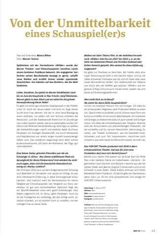 BEST OF BEST OF Promi 132Text und Intervie Bianca RitterFoto: Werner TschanSp%u00e4testens mit der Fernsehserie %u00abWilder%u00bb wurde der Berner Theater- und Filmschauspieler Jonathan Loosli einem breiteren Publikum bekannt. Als engagierter Verfechter seines Berufsstands bewegt er gerne, schafft neue Welten und erz%u00e4hlt immer wieder spannende Geschichten. Am liebsten auf den Brettern, die die Welt bedeuten.Lieber Jonathan, Du spielst im Berner Stadttheater noch bis im Juni die Hauptrolle in Max Frischs %u00abGraf %u00d6derland%u00bb. Worum gehts in dem St%u00fcck und wo siehst Du die gr%u00f6sste Herausforderung dieser Rolle?Es geht um einen gut situierten Staatsanwalt in der Midlifecrisis. Er sucht ein neues Leben und lernt im Zuge dieser Suche eine Frau kennen, mit der er eine neue Bewegung, einen Aufstand, ins Leben ruft. Am Schluss scheitert die Revolution, und der Staatsanwalt fi ndet sich im Grunde genau in dem System wieder, das er zu bek%u00e4mpfen suchte. Ich sehe in der Rolle die Herausforderung, eine Figur zu spielen, die Grenzerfahrungen macht und erkenne dabei durchaus Parallelen zur heutigen Gesellschaft, die durch Wohlstand und Kapitalismus von einem engen Korsett zusammengehalten wird. Das wiederum beg%u00fcnstigt dann eben solche Ausbruchsversuche. Ich kann die Motivation der Figur gut nachvollziehen.Eine Deiner bisher gr%u00f6ssten Filmrollen war die als Schwinger in %u00abDinu%u00bb. War dieses einf%u00fchlsame Werk ein Sprungbrett f%u00fcr Deine Filmkarriere? Und w%u00fcrdest Du nicht auch sagen, dass sich die Geschichte thematisch ein wenig an %u00abRocky%u00bb anlehnt?Der Film kam 2012 kurz vor dem Eidgen%u00f6ssischen Schwingund %u00c4lplerfest im Fernsehen und wurde ein Erfolg. Es war eine interessante Erfahrung, in diese Schwingerwelt einzutauchen. Und nat%u00fcrlich wars ein Karriereschub f%u00fcr meine T%u00e4tigkeit als Filmschauspieler. Der Vergleich zur Story von %u00abRocky%u00bb ist gut und nachvollziehbar. Nat%u00fcrlich folgt dieser Sportfi lmklassiker einer sehr guten Dramaturgie, man fi ebert regelrecht mit. In %u00abDinu%u00bb gibts Parallelen. Auch da ist der Protagonist ein Underdog, der den Erfolg sucht, zun%u00e4chst scheitert, um es letztlich doch zu schaffen; mit der richtigen Frau an seiner Seite.Bleiben wir beim Thema Film: In der beliebten Fernsehserie %u00abWilder%u00bb hast Du von 2017 bis 2022 u. a. an der Seite von bekannten Mimen wie Christian Kohlund oder Esther Gemsch gespielt. Wie wertest Du diese Erfahrung insgesamt? Da gibts nur Positives zu berichten. Wir hatten stets eine super Stimmung am Dreh in den Glarner Alpen. Und ja, die halbe Schweizer Filmszene war da und ich habe viele neue Leute kennenlernen d%u00fcrfen. Die Leidenschaft der Akteure war durch alle vier Staffeln gut sp%u00fcrbar. %u00abWilder%u00bb war ein grosser Erfolg und wird auch heute immer wieder neu entdeckt auf Streamingplattformen. Was treibt Dich an im Beruf? Wo siehst Du deine Skills haupts%u00e4chlich?Ich bin ein kreativer Mensch mit viel Energie. Ich liebe es, als Schauspieler, Regisseur oder Produzent Welten zu kreieren, Geschichten zu erz%u00e4hlen und so (m)eine neue Form von Kunst zu schaffen. Es ist wie ein Wechselspiel. Ich investiere viel Energie und bekomme dadurch auch wieder viel Energie retour. Ich liebe die Unmittelbarkeit des Theaters. Manche sind der Konsumation von pfannenfertigen Produkten, die sie via Netflix und Co. serviert bekommen, %u00fcberdr%u00fcssig. Zu sehen, wie Theater funktioniert, wie die Darsteller:innen schwitzen und zum Teil improvisieren, manchmal auch scheitern, das zieht heute die Menschen wieder vermehrt an. Das VOR ORT Theater produziert seit 2010 in Bern ortsassoziatives Theater. Auf was f%u00fcr eine neue Produktion darf man sich derzeit freuen?Bereits zum vierten Mal spielen wir ab Ende April bis Mitte Mai in der Heiteren Fahne ein Volkstheater. %u00abJenseits %u2013 Es geschehen noch Zeichen und Wunder%u00bb stammt aus der beliebten Feder vom Berner Original Timmermahn und ist ein Schwank in zwei Akten. Diese Events erfreuen sich hoher Beliebtheit beim Publikum. Zun%u00e4chst gibts ein Nachtessen, bevor dann um 20 Uhr eine sympathische und witzige Art VOR ORT-Chaos ausbricht. Geburtstag: 3. Februar 1979 Wohnort: BernWeb: www.jonathanloosli.chFacebook: jonathan.loosli.3Instagram: jonathanloosliIn K%u00fcrze: Will man den Berufsalltag des vielseitigen Schweizer Schauspielers Jonathan Loosli beschreiben, nennt man am einfachsten einige Filme oder Theaterproduktionen, mit denen er sehr erfolgreich war und ist. Die Krimiserie %u00abWilder%u00bb oder Filme wie %u00abDinu%u00bb und %u00abZwingli%u00bb geh%u00f6ren da genauso dazu wie das aktuelle St%u00fcck %u00abGraf %u00d6derland%u00bb im Berner Stadttheater.Von der Unmittelbarkeit eines Schauspiel(er)s