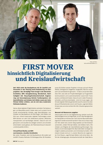 14 BEST OF %u00dcberregional 1 BEST OF Portrait xxx FIRST MOVER hinsichtlich Digitalisierung und KreislaufwirtschaftSeit 1953 steht die BauSpektrum AG f%u00fcr Qualit%u00e4t und Innovation in der Planung sowie Realisierung von Bauprojekten. Das 35-k%u00f6pfi ge Team bringt in den Bereichen Architektur, BIM, Energieberatung, Brandschutz, Nachhaltigkeit inkl. Recycling/Kreislaufwirtschaft, Engineering und Generalplanung h%u00f6chste Fachkompetenz mit. Gesch%u00e4ftsleiter und Inhaber Ueli Gfeller sowie sein Sohn Michael Gfeller erkl%u00e4ren, wie sie sich dazu modernster Methoden bedienen. Genau diese digitalen M%u00f6glichkeiten ver%u00e4ndern Fachplanungen und Baustelle positiv, bieten aber auch unserer Kundschaft entscheidende Vorteile, sagt Gesch%u00e4ftsleiter und Inhaber der BauSpektrum AG M%u00fcnsingen, Ueli Gfeller und f%u00fchrt aus: %u00abDank modernster, digitaler Technologien sowie BIM k%u00f6nnen wir sehr fr%u00fch bedeutend pr%u00e4ziser, effi zienter, transparenter und nachhaltiger arbeiten. Dadurch wird mit genaueren und visuellen Grundlagen sicherer und schneller entschieden sowie gebaut, der Materialverbrauch reduziert und die Qualit%u00e4t erh%u00f6ht.%u00bb Virtual/Mixed Reality und BIM zum besseren, visuellen Verst%u00e4ndnisBei vielen Projekten setzt die BauSpektrum AG zudem auf die BIM-Prozess-Methode. Mit fehlergepr%u00fcften 3D-Modellen sowie 3D-Brillen werden Projekte in Virtual und auch Mixed Reality (Hologramm) begehbar dargestellt, R%u00e4ume visualisiert und verst%u00e4ndlicher gemacht %u2013 im B%u00fcro und auf dem Bau. Dies hilft, dass alle am Projekt Beteiligten auf Augenh%u00f6he kommunizieren und zusammenarbeiten sowie mehr Transparenz und %u00dcbersicht haben. Dadurch wird in allen Prozessen schneller und fi nal entschieden. %u00abUnd ich muss sagen, der Einsatz digitaler Werkzeuge bereitet sowohl unseren Kunden als auch Mitarbeitenden enorm viel Freude%u00bb, sagt Ueli Gfeller. Es kann also von einer echten Win-Win-Situation gesprochen werden!Bewusst mit Ressourcen umgehenHeute spielt nicht nur die Digitalisierung, sondern auch die Nachhaltigkeit eine wichtige Rolle, ist sich das Management der BauSpektrum AG bewusst. Doch k%u00f6nnen Baumaterialien eigentlich wiederverwendet werden? %u00abDas ist durchaus m%u00f6glich! Wir setzen bei unseren Bauprojekten auf die Kreislaufwirtschaft%u00bb, erkl%u00e4rt Michael Gfeller, Ueli Gfellers Sohn, Mitinhaber und Mitglied der Gesch%u00e4ftsleitung M%u00fcnsingen. Das heisst, es wird darauf geachtet, Baumaterialien so lange wie m%u00f6glich wiederzuverwenden und im Kreislauf zu halten. %u00abMit diesem Ansatz sind wir in unserer Branche ein sogenannter First Mover%u00bb, sagt Michael Gfeller nicht ohne Stolz. Als Teil der Arbeitsgruppe %u00abKreislaufwirtschaft der Stadt Bern%u00bb Vater und Sohn: Ueli und Michael Gfeller (v. l.)