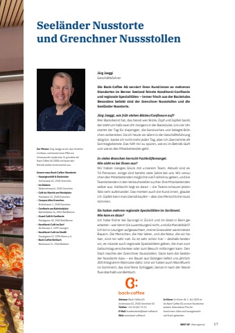 BEST OF BEST OF %u00dcberregional Interview 170Adresse: Back-Caffee AGArchstrasse 42, 2540 Grenchen SOTelefon: +41 32 652 15 15E-Mail: kundendienst@back-caffee.chWeb: www.back-caffee.chIn K%u00fcrze: In K%u00fcrze: Ab 1. Juli 2025 ist die Back-Caffee AG an neun Stand orten pr%u00e4sent. Besonderes Plus f%u00fcr Kund:innen: Alles wird hausgemacht und frisch gebacken.Zur Person: J%u00fcrg Jaeggi ist eid. dipl. KonditorConfi seur und besitzt einen MBA mit Schwerpunkt Leadership. Er gr%u00fcndete die Back-Caffee AG 2008 und baute den Betrieb seither kontinuierlich aus.Unsere neun Back-Caffee-Standorte:%u2022 Hauptgesch%u00e4ft & Backstube Archstrasse 42, 2540 Grenchen%u2022 Im D%u00e4deriz D%u00e4derizstrasse 6, 2540 Grenchen%u2022 Caf%u00e9 du March%u00e9 am Marktplatz Marktplatz 22, 2540 Grenchen%u2022 Campus hftm Grenchen Br%u00fchlstrasse 1, 2540 Grenchen%u2022 Confi serie am Bahnhofplatz Bahnhofplatz 2a, 2502 Biel/Bienne%u2022 Grand Caf%u00e9 & Confi serie Marktgasse 18, 2502 Biel/Bienne%u2022 Konditorei-Caf%u00e9 im Dorf Dorfstrasse 1, 3297 Leuzigen%u2022 Konditorei-Caf%u00e9 im Stedtli Hauptgasse 15, 3294 B%u00fcren a. A.%u2022 Back-Caffee Bettlach Bielstrasse 31, 2544 BettlachJ%u00fcrg JaeggiGesch%u00e4ftsf%u00fchrerDie Back-Caffee AG serviert ihren Kund:innen an mehreren Standorten im Berner Seeland feinste Konditorei-Confi serie und regionale Spezi alit%u00e4ten %u2013 immer frisch aus der Back stube. Besonders beliebt sind der Grenchner Nussstollen und die Seel%u00e4nder Nusstorte.J%u00fcrg Jaeggi, wie fr%u00fch stehen B%u00e4cker/Confi seure auf?Wer Backdienst hat, das heisst wer Brote, Zopf und Gipfeli backt, der steht um halb zwei Uhr morgens in der Backstube. Um vier Uhr startet der Tag f%u00fcr diejenigen, die Sandwiches und belegte Br%u00f6tchen vorbereiten. Da ich heute vor allem in der Gesch%u00e4ftsf%u00fchrung t%u00e4tig bin, backe ich nicht mehr jeden Tag, aber ich %u00fcbernehme oft Sonntagsdienste. Das hilft mir zu sp%u00fcren, wie es im Betrieb l%u00e4uft und wie es den Mitarbeitenden geht. In vielen Branchen herrscht Fachkr%u00e4ftemangel. Wie sieht es bei Ihnen aus?Wir haben riesiges Gl%u00fcck mit unserem Team. Aktuell sind es 74%u00a0Personen, einige sind bereits viele Jahre bei uns. Wir versuchen den Mitarbeitenden m%u00f6glichst viel Freiheit zu geben, und die Teamleitenden in den Verkaufsstellen suchen Ihre Mitarbeitenden selber aus. Vielleicht liegt es daran %u2013 die Teams schauen jedenfalls sehr aufeinander. Das merken auch die Kund:innen, glaube ich. Gipfeli kann man %u00fcberall kaufen %u2013 aber das Menschliche muss stimmen.Sie haben mehrere regionale Spezialit%u00e4ten im Sortiment. Wie kam es dazu? Ich habe fr%u00fcher bei Spr%u00fcngli in Z%u00fcrich und im Glatz in Bern gearbeitet %u2013 wer kennt die Luxemburgerli nicht, und die Mandelb%u00e4rli? Ich bin in Leuzigen aufgewachsen, meine Grossv%u00e4ter waren beide Bauern. Die Menschen, die hier leben, und die Natur, die wir haben, sind mir sehr nah. Es ist sehr sch%u00f6n hier %u2013 deshalb fanden wir, es m%u00fcsste auch regionale Spezialit%u00e4ten geben, die man zum Geburtstag verschenken oder zum Besuch mitbringen kann. Den Start machte der Grenchner Nussstollen. Dann kam die Seel%u00e4nder Nusstorte dazu %u2013 ein Bauer aus Dotzigen liefert uns j%u00e4hrlich 300%u00a0Kilogramm Waln%u00fcsse daf%u00fcr. Und wir haben auch Wandfluerli im Sortiment, das sind feine Sch%u00f6ggeli, benannt nach der Wandflue oberhalb von Bettlach.Seel%u00e4nder Nusstorte und Grenchner Nussstollen
