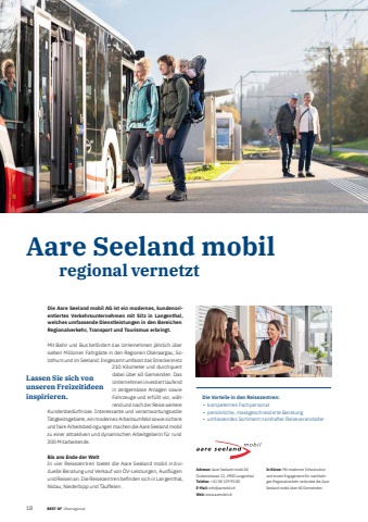 183 BEST OF BEST OF %u00dcberregional Portrait xxxAare Seeland mobil regional vernetztAdresse: Aare Seeland mobil AGGrubenstrasse 12, 4900 LangenthalTelefon: +41 58 329 93 00E-Mail: info@asmobil.chWeb: www.asmobil.chIn K%u00fcrze: Mit moderner Infrastruktur und einem Engagement f%u00fcr nachhaltigen Regionalverkehr verbindet die Aare Seeland mobil %u00fcber 60 Gemeinden.Die Vorteile in den Reisezentren:%u2022 kompetentes Fachpersonal%u2022 pers%u00f6nliche, massgeschneiderte Beratung%u2022 umfassendes Sortiment namhafter ReiseveranstalterDie Aare Seeland mobil AG ist ein modernes, kundenorientiertes Verkehrsunternehmen mit Sitz in Langenthal, welches umfassende Dienstleistungen in den Bereichen Regionalverkehr, Transport und Tourismus erbringt. Mit Bahn und Bus bef%u00f6rdert das Unternehmen j%u00e4hrlich %u00fcber sieben Millionen Fahrg%u00e4ste in den Regionen Oberaargau, Solothurn und im Seeland. Insgesamt umfasst das Streckennetz 210 Kilometer und durchquert dabei %u00fcber 60 Gemeinden. Das Unternehmen investiert laufend in zeitgem%u00e4sse Anlagen sowie Fahrzeuge und erf%u00fcllt vor, w%u00e4hrend und nach der Reise weitere Kundenbed%u00fcrfnisse. Interessante und verantwortungsvolle T%u00e4tigkeitsgebiete, ein modernes Arbeitsumfeld sowie sichere und faire Arbeitsbedingungen machen die Aare Seeland mobil zu einer attraktiven und dynamischen Arbeitgeberin f%u00fcr rund 300 Mitarbeitende. Bis ans Ende der WeltIn vier Reisezentren bietet die Aare Seeland mobil individuelle Beratung und Verkauf von %u00d6V-Leistungen, Ausfl%u00fcgen und Reisen an. Die Reisezentren befi nden sich in Langenthal, Nidau, Niederbipp und T%u00e4uffelen.Lassen Sie sich vonunseren Freizeitideeninspirieren.