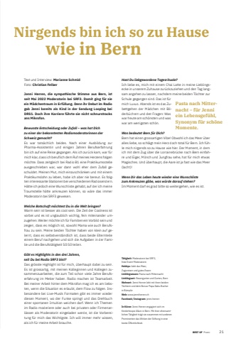 BEST OF BEST OF Promi 212Text und Intervie Marianne SchmidFoto: Christian FelberJenni Herren, die sympathische Stimme aus Bern, ist seit Mai 2022 Moderatorin bei SRF3. Damit ging f%u00fcr sie ein M%u00e4dchentraum in Erf%u00fcllung. Denn ihr Debut im Radio gab Jenni bereits als Kind in der Sendung Looping bei DRS1. Doch ihre Karriere f%u00fchrte sie nicht schnurstracks ans Mikro fon. Bewusste Entscheidung oder Zufall %u2013 was hat Dich zu einer der bekanntesten Radiomoderatorinnen der Schweiz gemacht? Es war tats%u00e4chlich beides. Nach einer Ausbildung zur Pharma -Assistentin und einigen Jahren Berufserfahrung bin ich auf eine Reise gegangen. Als ich zur%u00fcck kam, war f%u00fcr mich klar, dass ich beruflich dem Ruf meines Herzens folgen m%u00f6chte. Dass zeitgleich bei Radio B1 eine Praktikums stelle ausgeschrieben war, war dann wohl eher dem Zufall geschuldet. Meinen Mut, mich einzuschr%u00e4nken und mit einem Praktikumslohn zu leben, habe ich aber nie bereut. Es folgten interessante Stationen bei verschiedenen Radio sendern. H%u00e4tte ich jedoch eine Wunschliste gehabt, auf der ich meine Traumstelle h%u00e4tte ankreuzen k%u00f6nnen, so w%u00e4re das immer Moderatorin bei SRF3 gewesen.Welche Botschaft m%u00f6chtest Du in die Welt bringen?Warm sein ist besser als cool sein. Die Zeit der Coolness ist vorbei und es ist unglaublich wichtig, fein miteinander umzugehen. Weiter m%u00f6chte ich f%u00fcr Familien ein Vorbild sein und zeigen, dass es m%u00f6glich ist, sowohl Mama wie auch Berufsfrau zu sein. Meine beiden T%u00f6chter haben von klein auf gelernt, dass es selbstverst%u00e4ndlich ist, dass beide Elternteile einem Beruf nachgehen und sich die Aufgaben in der Familie und die Berufst%u00e4tigkeit 50:50 teilen.Gibt es Highlights in den drei Jahren, seit Du bei Radio SRF3 bist?Das gr%u00f6sste Highlight ist f%u00fcr mich, %u00fcberhaupt dabei zu sein. Es ist grossartig, mit meinen Kolleginnen und Kollegen zusammenzuarbeiten, die zum Teil schon viele Jahre Berufserfahrung im Metier haben. Radio machen ist Teamarbeit. Bei meiner Arbeit hinter dem Mikrofon mag ich es am liebsten, wenn die Situation es erlaubt, dem Flow zu folgen. Insbesondere bei Live-Musik Formaten gibt es immer wieder diesen Moment, wo der Funke springt und das Drehbuch einer spontanen Intuition weichen darf. Wenn ich Themen im Radio moderiere oder auch bei privaten oder Firmenanl%u00e4ssen als Moderatorin eingeladen werde, ist die Vorbereitung f%u00fcr mich das Wichtigste. Ich will immer mehr wissen, als ich f%u00fcr meine Arbeit brauche.Hast Du liebgewordene Tagesrituale?Ich liebe es, mich mit einem Chai Latte in meine Lieblingsecke in unserem Zuhause zur%u00fcckzuziehen und den Tag langsam angehen zu lassen, nachdem meine beiden T%u00f6chter zur Schule gegangen sind. Das ist f%u00fcr mich Luxus. Abends ist es das Zubettgehen der M%u00e4dchen mit Bilderb%u00fcchern und den Fragen: Was war heute am sch%u00f6nsten und was war am wenigsten sch%u00f6n. Was bedeutet Bern f%u00fcr Dich?Bern hat einen grossartigen Vibe! Obwohl ich das Meer %u00fcber alles liebe, so schl%u00e4gt mein Herz doch total f%u00fcr Bern. Ich f%u00fchle mich nirgends so zu Hause wie hier. Der Moment, in dem ich mit dem Zug %u00fcber die Lorrainebr%u00fccke nach Bern einfahre und Eiger, M%u00f6nch und Jungfrau sehe, hat f%u00fcr mich etwas Magisches. Und %u00fcberhaupt, die Aare ist ja fast wie das Meer (lacht)! Wenn Dir das Leben heute wieder eine Wunschliste zum Ankreuzen g%u00e4be, was w%u00fcrde darauf stehen?Im Moment darf es grad bitte so weitergehen, wie es ist.T%u00e4tigkeit: Moderatorin bei SRF3, freie Event-ModeratorinHobbys: liebt das Meer, Zugsreisen und gutes EssenLieblingsessen: Pasta nach MitternachtLieblingsort: Rosengarten und Gurten, BernWohnort: Jenni Herren lebt mit ihren beiden T%u00f6chtern und dem Bonus-Papa Dabu Bucher in B%u00fcmplizWeb: www.jenniherren.chFacebook / Instagram: jenni.herren In K%u00fcrze: Jenni Herren engagiert sich im Kinderhospiz Allani in Bern. Mit ihrer ehrenamtlichen T%u00e4tigkeit tr%u00e4gt sie zusammen mit anderen Prominenten das Wirken der Stiftung in eine breite %u00d6ffentlichkeit.Nirgends bin ich so zu Hause wie in Bern Pasta nach Mitternacht %u2013 f%u00fcr Jenni ein Lebensgef%u00fchl, Syno nym f%u00fcr sch%u00f6ne Momente.