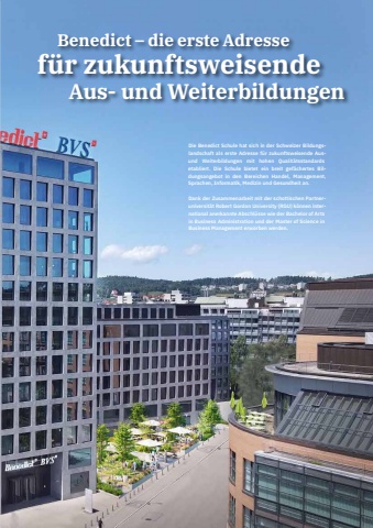BEST OF BEST OF Bern Mittelland Portrait xxx 2314Die Benedict Schule hat sich in der Schweizer Bildungslandschaft als erste Adresse f%u00fcr zukunftsweisende Ausund Weiterbildungen mit hohen Qualit%u00e4tsstandards etabliert. Die Schule bietet ein breit gef%u00e4chertes Bildungsangebot in den Bereichen Handel, Management, Sprachen, Informatik, Medizin und Gesundheit an.Dank der Zusammenarbeit mit der schottischen Partneruniversit%u00e4t Robert Gordon University (RGU) k%u00f6nnen international anerkannte Abschl%u00fcsse wie der Bachelor of Arts in Business Administration und der Master of Science in Business Management erworben werden. Benedict %u2013 die erste Adresse f%u00fcr zukunftsweisende Aus- und Weiterbildungen