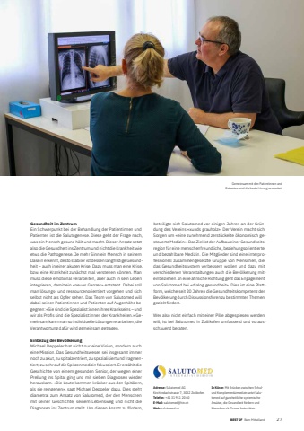 BEST OF BEST OF Bern Mittelland Portrait xxx 2756Adresse: Salutomed AGKirchlindachstrasse 7, 3052 ZollikofenTelefon: +41 31 911 20 60E-Mail: salutomed@hin.chWeb: salutomed.chIn K%u00fcrze: Mit Br%u00fccken zwischen Schulund Komplement%u00e4rmedizin setzt Salutomed auf ganzheitliche systemische Ans%u00e4tze, die Gesundheit f%u00f6rdern und Menschen als Ganzes betrachten.Gesundheit im ZentrumEin Schwerpunkt bei der Behandlung der Patientinnen und Patienten ist die Salutogenese. Diese geht der Frage nach, was ein Mensch gesund h%u00e4lt und macht. Dieser Ansatz setzt also die Gesundheit ins Zentrum und nicht die Krankheit wie etwa die Pathogenese. Je mehr Sinn ein Mensch in seinem Dasein erkennt, desto stabiler ist dessen langfristige Gesundheit %u2013 auch in einer akuten Krise. Dazu muss man eine Krise, bzw. eine Krankheit zun%u00e4chst mal verstehen k%u00f6nnen. Man muss diese emotional verarbeiten, aber auch in sein Leben integrieren, damit ein %u00abneues Ganzes%u00bb entsteht. Dabei soll man l%u00f6sungs- und ressourcenorientiert vorgehen und sich selbst nicht als Opfer sehen. Das Team von Salutomed will dabei seinen Patientinnen und Patienten auf Augenh%u00f6he begegnen: %u00abSie sind die Spezialist:innen ihres Krankseins %u2013 und wir als Profi s sind die Spezialist:innen der Krankheiten.%u00bb Gemeinsam kann man so individuelle L%u00f6sungen erarbeiten, die Verantwortung daf%u00fcr wird gemeinsam getragen.Einbezug der Bev%u00f6lkerungMichael Deppeler hat nicht nur eine Vision, sondern auch eine Mission. Das Gesundheitswesen sei insgesamt immer noch zu akut, zu spitalzentriert, zu spezialisiert und fragmentiert, zu sehr auf die Spitzenmedizin fokussiert. Er erz%u00e4hlt die Geschichte von einem gesunden Senior, der wegen einer Prellung ins Spital ging und mit sieben Diagnosen wieder herauskam. %u00abDie Leute kommen kr%u00e4nker aus den Spit%u00e4lern, als sie reingehen%u00bb, sagt Michael Deppeler dazu. Dies steht diametral zum Ansatz von Salutomed, der den Menschen mit seiner Geschichte, seinem Lebensweg und nicht die Diagnosen ins Zentrum stellt. Um diesen Ansatz zu f%u00f6rdern, beteiligte sich Salutomed vor einigen Jahren an der Gr%u00fcndung des Vereins %u00abxunds grauholz%u00bb. Der Verein macht sich Sorgen um %u00abeine zunehmend zerst%u00fcckelte %u00f6konomisch gesteuerte Medizin%u00bb. Das Ziel ist der Aufbau einer Gesundheitsregion f%u00fcr eine menschenfreundliche, beziehungsorientierte und bezahlbare Medizin. Die Mitglieder sind eine interprofessionell zusammengesetzte Gruppe von Menschen, die das Gesundheitssystem verbessern wollen und dazu mit verschiedenen Veranstaltungen auch die Bev%u00f6lkerung miteinbeziehen. In eine %u00e4hnliche Richtung geht das Engagement von Salutomed bei %u00abdialog gesundheit%u00bb. Dies ist eine Plattform, welche seit 20 Jahren die Gesundheitskompetenz der Bev%u00f6lkerung durch Diskussionsforen zu bestimmten Themen gezielt f%u00f6rdert. Wer also nicht einfach mit einer Pille abgespiesen werden will, ist bei Salutomed in Zollikofen umfassend und vorausschauend beraten. Gemeinsam mit den Patientinnen und Patienten wird die beste L%u00f6sung erarbeitet.