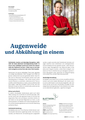 BEST OF BEST OF Bern Mittelland Portrait xxx 3118 Augenweideund Abk%u00fchlung in einemIndividuelle, kreative und lebendige Naturg%u00e4rten, daf%u00fcr steht der Name Blattwerk Gartengestaltung GmbH. In einem solch vielf%u00e4ltigen Gartenraum bietet eine Wasserstelle das T%u00fcpfelchen auf dem i. Dabei muss es sich aber nicht zwingend um einen Pool oder einen Teich handeln.Gemeinsam mit seinem elfk%u00f6pfi gen Team plant, gestaltet und pflegt Gesch%u00e4ftsleiter Mario Veraguth seit 2008 mit grosser Leidenschaft naturnah gestaltete G%u00e4rten. Darin fi nden nicht nur Menschen ihre Ruheoase, sondern auch viele Kleinlebewesen ihr Refugium. %u00abWir achten darauf, einheimische Pflanzen zu verwenden, Lebensr%u00e4ume f%u00fcr Tiere zu schaffen, lokale Materialien zu nutzen und so zur Biodiversit%u00e4t beizutragen%u00bb, sagt Mario Veraguth. Damit ist klar, wenn die Blattwerk-Equipe am Werk ist, entsteht alles andere als %u00f6de Rasenfl%u00e4chen oder Steinw%u00fcsten.Erfreut und erfrischtIn solche individuellen Gartenr%u00e4ume passt auch keine 0815-L%u00f6sung, die im Sommer f%u00fcr Erfrischung sorgt. %u00abWer auf der Suche nach dem gewissen Etwas ist und auch bei begrenztem Platz nicht auf Wasser verzichten m%u00f6chte, f%u00fcr den haben wir die optimale M%u00f6glichkeit zur Hand%u00bb, so der Gartenspezialist. Ein Badebrunnen bietet das gesamte Jahr ein sch%u00f6nes Gestaltungselement und im Sommer Abk%u00fchlung auf kleinem Raum. Individuelle GestaltungDie Badebrunnen der Firma Poolman GmbH k%u00f6nnen nach individuellen W%u00fcnschen angefertigt werden. Die Gr%u00f6sse ist variabel, das Material der Ummantelung kann ausgew%u00e4hlt werden, es gibt versenkte oder freistehende Varianten und sogar zwischen einer einfacheren und umfangreicheren Schwimmbadtechnik kann gew%u00e4hlt werden. %u00abNach Wunsch k%u00f6nnen sogar Massaged%u00fcsen oder Beleuchtungen im Badebrunnen integriert werden%u00bb, erkl%u00e4rt Mario Veraguth. Und damit der Pool im Kleinformat auch %u00f6kologisch optimal in einen Naturgarten passt, geschieht die Wasserreinigung nicht mittels Chlor, sondern dank Aktivsauerstoff. Nachhaltige HerstellungDer Badebrunnen bietet nicht nur einen umweltfreundlichen, sondern auch einen lokalen Blickfang f%u00fcr den Garten, denn er wird zu 100 Prozent in der Schweiz hergestellt. %u00abWir sind immer auf der Suche nach individuellen L%u00f6sungen f%u00fcr eine zeitgem%u00e4sse Gartengestaltung. Mit dem Badebrunnen haben wir ein tolles Element gefunden%u00bb, sagt Mario Veraguth.Adresse:Blattwerk Gartengestaltung GmbH L%u00e4ngmattweg/Postfach 2213053 M%u00fcnchenbuchseeTelefon: +41 31 869 00 31 E-Mail: info@blatt-werk.netWeb: www.blatt-werk.netInstagram: blattwerkgartengestaltungIn K%u00fcrze: Die Blattwerk Gartengestaltung GmbH plant, gestaltet und pflegt G%u00e4rten. Im Fokus steht das Leben im Garten %u2013 sowohl der Menschen als auch der Tiere und Pflanzen. So entstehen massgeschneiderte L%u00f6sungen, die zum Garten und zur Umgebung passen.Mario VeraguthGesch%u00e4ftsleiter Beratung, Planung und Offerten Firmengr%u00fcndung 2008Ausbildungen: %u2022 Baumschulist EFZ und Landschaftsg%u00e4rtner EFZ%u2022 Berufspr%u00fcfung Oberg%u00e4rtner FA%u2022 eidgen%u00f6ssischer Berufsbildner mit FA%u2022 Fachmann in Gartengestaltung (ZHAW)%u2022 Fachperson Biodiversit%u00e4t (Jardin Suisse)