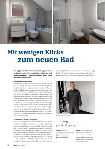 323 BEST OF BEST OF Bern Mittelland Portrait xxxMit wenigen Klicks zum neuen BadAdresse: Hegg Sanit%u00e4r AGDammweg 39, 3053 M%u00fcnchenbuchseeTelefon: +41 31 868 30 30E-Mail: sanitaer@hegg.chWeb: www.heggsanitaer.chIn K%u00fcrze: Seit 1875 sorgt die Hegg Sanit%u00e4r AG in M%u00fcnchenbuchsee f%u00fcr funktionierende sanit%u00e4re Anlagen. Dank eines guten regionalen Netzwerks und des Online-Konfi gurators k%u00f6nnen Badsanierungen und -neubauten sehr schnell umgesetzt werden.Die Hegg Sanit%u00e4r AG bietet einen schnellen, professionellen Sanit%u00e4r-Service. Sie ist spezialisiert auf den Um- und Neubau von B%u00e4dern %u2013 Kund:innen k%u00f6nnen diesen online zeitsparend konfi gurieren.Das neue Bad online planenDie Hegg Sanit%u00e4r AG ist in der Grossregion Bern schon seit 1875 ein Begriff. Sie bietet s%u00e4mtliche Dienstleistungen im Sanit%u00e4rbereich an und legt dabei einen besonderen Fokus auf das Thema Badumbau-Management. Kund:innen steht auf der Firmenwebseite ein Bad-Koordinator zur Verf%u00fcgung, mit dem sie sich ein detailliertes Bild davon machen k%u00f6nnen, welche M%u00f6glichkeiten verf%u00fcgbar sind. Soll das Bad klassisch oder modern daherkommen %u2013 oder doch eher skandinavisch? Wie sollen die Armaturen aussehen, wie der Heizk%u00f6rper und wie die Wand- und Bodenbel%u00e4ge? Auch die Masse, das Budget und der Grundrissplan werden erfasst. Innert weniger Minuten erhalten Interessierte eine erste Kosteneinsch%u00e4tzung f%u00fcr das neue oder renovierte Traumbad, die anschliessend ein Erstgespr%u00e4ch auf einer soliden Basis erm%u00f6glicht. Vom ersten Anruf bis zur %u00dcbergabe des fertigen Badezimmers vergehen so nur wenige Monate.Zuverl%u00e4ssige Arbeit aus der Region%u00abWir sind zust%u00e4ndig f%u00fcr das Lebensmittel Nummer 1, deshalb ist es sehr wichtig, dass unsere Arbeit %u2039verh%u00e4bt%u203a%u00bb, sagt Marcel Brunner, Gesch%u00e4ftsleiter der Hegg Sanit%u00e4r AG, mit einem L%u00e4cheln. Stimmt absolut %u2013 ohne Wasser geht es nicht, und wenn es irgendwo tropft oder klemmt, geraten wir schnell in Not. Sein Unternehmen ist gut vernetzt mit anderen Betrieben in der Region, so dass die Firmenphilosophie, die Kund:innen zu unterst%u00fctzen, einwandfrei umgesetzt werden kann. Zeitpl%u00e4ne werden eingehalten, und Absprachen funktionieren. %u00abEs ist ein sch%u00f6ner, abwechslungsreicher Job%u00bb, so Marcel Brunner. Das best%u00e4tigt sich auch beim Blick auf das Team der Hegg Sanit%u00e4r AG %u2013 es besteht ausschliesslich aus langj%u00e4hrigen Mitarbeitenden, die zum Teil schon ihre Lehre hier absolvierten.Marcel Brunner, Gesch%u00e4ftsf%u00fchrer