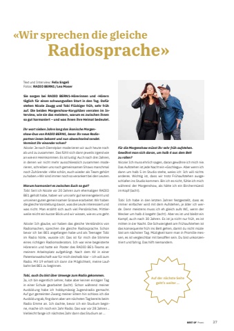 BEST OF BEST OF Promi 372Text und Intervie Felix EngeliFotos: RADIO BERN1 / Lea MoserSie sorgen bei RADIO BERN1-H%u00f6rerinnen und -H%u00f6rern t%u00e4glich f%u00fcr einen schwungvollen Start in den Tag. Daf%u00fcr stehen Nicole Zaugg und Tobi Fl%u00fcckiger fr%u00fch, sehr fr%u00fch auf. Die beiden Morgenshow-Koryph%u00e4en verraten im Interview, wie sie das meistern, warum es zwischen ihnen so gut harmoniert %u2013 und was ihnen ihre Heimat bedeutet.Ihr wart sieben Jahre lang das ikonische Morgenshow-Duo von RADIO BERN1, bevor Ihr neue Radiopartner:innen bekamt und nun abwechselnd sendet. Vermisst Ihr einander schon?Nicole: Je nach Dienstplan moderieren wir auch heute noch ab und zu zusammen. Das f%u00fchlt sich dann jeweils irgendwie an wie ein Heimkommen. Es ist lustig: Auch nach drei Jahren, in denen wir nicht mehr ausschliesslich zusammen moderieren, schreiben uns nach gemeinsamen Shows manchmal noch Zuh%u00f6rende: %u00abWie sch%u00f6n, euch wieder als Team geh%u00f6rt zu haben.%u00bb Wir sind immer noch so verankert bei den Leuten. Warum harmoniert es zwischen Euch so gut?Tobi: Seit ich Nicole vor 20 Jahren zum ehemaligen RADIO BE1 geholt habe, haben wir uns sehr gut kennengelernt und uns einen guten gemeinsamen Groove erarbeitet. Wir haben die gleiche Vorstellung davon, was die Leute interessiert und was nicht. Man erz%u00e4hlt sich auch viel Pers%u00f6nliches. Mittlerweile reicht ein kurzer Blick und wir wissen, wie es uns geht. Nicole: Ich glaube, wir haben das gleiche Verst%u00e4ndnis von Radiomachen, sprechen die gleiche Radiosprache. Schon bevor ich bei BE1 angefangen habe und als Teenager Tobi im Radio h%u00f6rte, wusste ich: Das ist f%u00fcr mich die Stimme eines richtigen Radiomoderators. Ich war eine begeisterte H%u00f6rererin und hatte ein Poster des RADIO BE1-Teams an meinem Arbeitsplatz aufgeh%u00e4ngt. Nach dem KV in einer Patent anwaltschaft war f%u00fcr mich deshalb klar %u2013 ich will zum Radio. Mit 19 erhielt ich dann die M%u00f6glichkeit, meine Laufbahn bei BE1 zu beginnen.Tobi, auch Du bist %u00fcber Umwege zum Radio gekommen.Ja, ich bin eigentlich Lehrer, habe aber keinen ein zigen Tag in einer Schule gearbeitet (lacht). Schon w%u00e4hrend meiner Ausbildung habe ich hobbym%u00e4ssig Jugendradio gemacht. Auf gut gemeinten Zwang meiner Eltern hin schloss ich die Ausbildung ab, fi ng dann aber am n%u00e4chsten Tag bereits beim Radio Emme an. Ich dachte, bevor ich ein Studium beginne, mache ich noch ein Jahr Radio. Das war vor 28 Jahren %u2026 Vielleicht fange ich n%u00e4chstes Jahr dann das Studium an %u2026F%u00fcr die Morgenshow m%u00fcsst Ihr sehr fr%u00fch aufstehen. Gew%u00f6hnt man sich daran, um halb 4 aus dem Bett zu rollen?Nicole: Ich muss ehrlich sagen, daran gew%u00f6hne ich mich nie. Das Aufstehen ist jede Nacht ein %u00abGschlegu%u00bb. Aber wenn ich dann um halb 5 im Studio stehe, weiss ich: Ich will nichts anderes. Wichtig ist, dass wir trotz Fr%u00fchaufstehen ausgeschlafen ins Studio kommen. Bin ich es nicht, f%u00fchle ich mich w%u00e4hrend der Morgenshow, als h%u00e4tte ich ein Bircherm%u00fcesli im Kopf (lacht).Tobi: Ich habe in den letzten Jahren festgestellt, dass es immer einfacher wird mit dem Aufstehen, je %u00e4lter ich werde. Denn meistens muss ich eh gleich aufs WC, wenn der Wecker um halb 4 losgeht (lacht). Aber es ist und bleibt ein Kampf, auch nach 30 Jahren. Es ist ja nicht nur fr%u00fch, es ist mitten in der Nacht. Die Schwierigkeit am Fr%u00fchaufstehen ist das konsequente fr%u00fch ins Bett gehen, damit du nicht m%u00fcde bist am n%u00e4chsten Tag. M%u00fcdigkeit kann man in Promille messen, es ist vergleichbar mit besoffen sein. Du bist unkonzentriert und fahrig. Das hilft niemandem.%u00abWir sprechen die gleiche Radiosprache%u00bbAuf der n%u00e4chste Seite geht%u2019s weiter %u2026