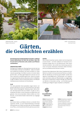 4231 BEST OF BEST OF Bern Mittelland Portrait xxx G%u00e4rten,die Geschichten erz%u00e4hlenAdresse: Glowing Grass GmbHGartenbau & Gartendesign Brauereiweg 3b, 3076 WorbTelefon: +41 31 839 99 90E-Mail: info@glowinggrass.chWeb: www.glowinggrass.chInstagram: glowing_grassIn K%u00fcrze: Glowing Grass ist spezialisiert auf die naturnahe, mensch- und tierfreundliche Gestaltung von G%u00e4rten, Terrassen und Balkonen. In Zusammenarbeit mit der Kundschaft entstehen individuelle Konzepte mit Fokus auf Biodiversit%u00e4t.Die Glowing Grass GmbH gestaltet kunstvolle, multifunktionale Lebensr%u00e4ume f%u00fcr mehr Stil und Natur. Darin f%u00fchlen sich nicht nur Menschen wohl, sondern auch Pflanzen und Kleintiere.ORIENTATION FOR%u00caTDie begr%u00fcnten Pergolas von Glowing Grass sind viel mehr als Schattenpl%u00e4tze. Das Dach wird bepflanzt %u2013 dadurch entsteht eine zus%u00e4tzliche Gr%u00fcnfl%u00e4che, die zudem erheblich zur Hitzereduzierung beitr%u00e4gt. Die W%u00e4nde werden mit einem %u00f6kologischen Kalk- und Naturpigmentgemisch verputzt und mit einer nat%u00fcrlichen Lein%u00f6lfarbe gestrichen. Dadurch entsteht ein angenehmes Raumklima. Besonders sch%u00f6n sind Bepflanzungen mit Bl%u00fcten, die bis im November bl%u00fchen, zum Beispiel Herbstanemonen kombiniert mit Prachtkerzen.PLAYMit Liebe gestaltete Naturspielpl%u00e4tze zeigen kleinen und grossen Abenteurer:innen auf, wieviel Potenzial in der Natur steckt. Kleine Kr%u00e4uterg%u00e4rten, Wasserpumpen, Steine, Wurzeln oder Baumabschnitte zum Klettern: Es gibt so viel zu entdecken! Der Natur und der Fantasie wird dabei freier Lauf gelassen. Denn die verwendeten H%u00f6lzer erz%u00e4hlen von ihren Wurzeln, und die Steine fl%u00fcstern Geschichten aus vergangenen Zeiten.NOOKAuch kleine G%u00e4rten und Balkone k%u00f6nnen zu stilvollen R%u00fcckzugsorten werden. Je nach Platzverh%u00e4ltnissen entwickelt Glowing Grass auch M%u00f6bel wie Sofas oder die Pflanzengef%u00e4sse auf Mass, um die bestehende Fl%u00e4che optimal auszunutzen. SUITESWenn Kinder erwachsen werden, %u00e4ndern sich die Anspr%u00fcche an einen Garten %u2013 wo fr%u00fcher vielleicht ein Trampolin f%u00fcr Kinderlachen sorgte, kann nun ein Wohnzimmer unter freiem Himmel entstehen. Dies schafft eine Verbindung zwischen innen und aussen. Besonders interessant dabei: Die Natur darf zur architektonischen Partnerin werden. Glowing Grass legt grossen Wert darauf, bestehende Gr%u00fcnfl%u00e4chen zu erhalten und neue biodiverse Fl%u00e4chen zu schaffen. Bei der Gestaltung und Sanierung der B%u00f6den werden %u00f6kologische Substratgemische, Pflanzenkohle und Gesteinsmehl verwendet, wobei die Pflanzenkohle zur langfristigen Bindung von Kohlenstoff im Boden beitr%u00e4gt. Die Pflanzung von B%u00e4umen ist besonders wichtig %u2013 und die Wahrung und Schaffung von Wegen f%u00fcr Igel, Amphibien und Reptilien.ORIENTATION FOR%u00caT %u2013 begr%u00fcnte Pergola zur HitzereduktionSUITES %u2013 wie ein Wohnzimmer unter freiem Himmel