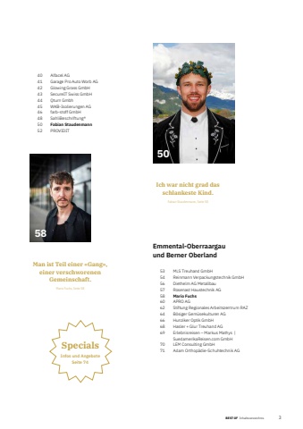 BEST OF Inhaltsverzeichnis 340 Alfacel AG41 Garage Pro Auto Worb AG42 Glowing Grass GmbH43 SecureIT Swiss GmbH44 Qturn Gmbh45 WKB-Isolierungen AG46 farb-stoff GmbH48 SahliBeschriftung%u00ae50 Fabian Staudenmann52 PROVIDITEmmental-Oberraargau und Berner Oberland53 MLS Treuhand GmbH54 Reinmann Verpackungstechnik GmbH56 Diethelm AG Metallbau57 Rosenast Haustechnik AG58 Mario Fuchs60 APRO AG62 Stiftung Regionales Arbeitszentrum RAZ64 B%u00f6siger Gem%u00fcsekulturen AG66 Hunziker Optik GmbH68 Hasler + Glur Treuhand AG69 Erlebnisreisen %u2013 Markus Mathys | SuedamerikaReisen.com GmbH70 LEM Consulting GmbH71 Adam Orthop%u00e4die-Schuhtechnik AG SpecialsInfos und AngeboteSeite 745058Man ist Teil einer %u00abGang%u00bb, einer verschworenen Gemeinschaft.Mario Fuchs, Seite 58Ich war nicht grad das schlankeste Kind.Fabian Staudenmann, Seite 50