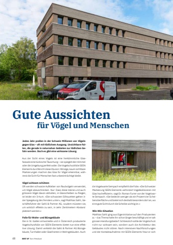 481 BEST OF BEST OF Bern Mittelland Portrait xxxGute Aussichten f%u00fcr V%u00f6gel und MenschenJedes Jahr prallen in der Schweiz Millionen von V%u00f6geln gegen Glas %u2013 oft mit t%u00f6dlichem Ausgang. Unsichtbare Fallen, die gerade in naturnahen Gebieten zur t%u00f6dlichen Gefahr werden. Doch es gibt eine wirksame L%u00f6sung.Aus der Sicht eines Vogels ist eine herk%u00f6mmliche Glasfassade eine t%u00fcckische T%u00e4uschung %u2013 sie spiegelt den Himmel oder die Umgebung perfekt wider. Die Vogelschutzfolie SEEN Elements durchbricht diese Illusion: Winzige, kaum sichtbare Markierungen machen das Glas f%u00fcr V%u00f6gel erkennbar, w%u00e4hrend die Sicht f%u00fcr Menschen fast unbeeintr%u00e4chtigt bleibt.V%u00f6gel wirksam sch%u00fctzenOft werden schwarze Aufkleber von Raubv%u00f6geln verwendet, um V%u00f6gel abzuschrecken. Nur: Dass diese kleine und auch gr%u00f6ssere V%u00f6gel davon abhalten, in Glasscheiben zu fliegen, ist leider ein Irrtum. %u00abDie schwarzen Silhouetten gehen in der Spiegelung des Fensters unter%u00bb, sagt Matthias Sahli, Gesch%u00e4ftsf%u00fchrer der Sahli & Partner AG, %u00abzudem m%u00fcssten sie, um wirklich effektiv zu sein, in zehn Zentimetern Abstand platziert werden.%u00bbFolie f%u00fcr Wohn- und B%u00fcrogeb%u00e4udeDie in St. Gallen entwickelte und in %u00d6sterreich produzierte Vogelschutzfolie von SEEN Elements bietet nun eine effektive L%u00f6sung. Damit verklebt die Sahli & Partner AG B%u00fcrogeb%u00e4ude, Turnhallen oder Glas fronten in Wohngeb%u00e4uden. Auch die Vogelwarte Sempach empfi ehlt die Folie. %u00abDie Schweizer Markierung SEEN Elements verhindert Vogelkollisionen mit Glas hocheffi zient%u00bb, sagt Dr. Roman Furrer von der Vogelwarte Sempach. %u00abSie bedeckt weniger als ein Prozent der Scheibenoberfl%u00e4che und bietet sich deshalb besonders dort an, wo eine gute Sicht durch die Scheibe wichtig ist.%u00bbWin-Win-SituationMatthias Sahli ging aus Eigeninitiative auf den Produzenten zu %u2013 das Thema hatte ihn schon l%u00e4nger besch%u00e4ftigt und er sah grossen Handlungsbedarf. Schliesslich sollte der Vogelschutz nicht nur wirksam sein, sondern auch die Architektur des Geb%u00e4udes nicht st%u00f6ren. Nach intensiven Nachforschungen und der Kontaktaufnahme mit SEEN Elements freut er sich