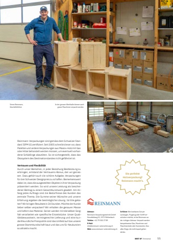 BEST OF BEST OFPortrait xxx Emmental 552Adresse:Reinmann Verpackungstechnik GmbHKreuzfeldweg 22, 3373 R%u00f6thenbachTelefon: +41 79 350 27 89E-Mail:info@reinmann-unternehmung.chWeb: www.reinmann-unternehmung.chIn K%u00fcrze: Wer kostbares Gut per Lastwagen, Flugzeug oder Schiff verschicken m%u00f6chte, ist bei Reinmann an der richtigen Adresse. Verpackt werden beispielsweise Glas, Maschinen und Maschinenteile oder Kunstwerke. Also alles Dinge, die nicht kaputt gehen d%u00fcrfen.Reinmann- Verpackungen sind gem%u00e4ss dem Schweizer Standard ISPM 15 zertifi ziert. Seit 2005 schreibt dieser vor, dass Paletten und andere Verpackungen aus Massiv-Holz mit Gas oder Hitze behandelt werden m%u00fcssen, um eventuell vorhandene Sch%u00e4dlinge abzut%u00f6ten. So ist sichergestellt, dass das %u00d6kosystem des Destinationslandes nicht gef%u00e4hrdet ist. Vertrauen und Flexibilit%u00e4tDurch unser Bem%u00fchen, in jeder Beziehung Bestleistung zu erbringen, entstand der Vertrauens-Bonus, den wir geniessen. Dazu geh%u00f6rt auch die sch%u00f6ne Aufgabe, Verpackungen f%u00fcr den Schweizer Designpreis zu schaffen. Bemerkenswert dabei ist, dass die ausge stellten Objekte in ihrer Verpackung pr%u00e4sentiert werden. So wird unsere Leistung als bescheidener Beitrag zu einem Gesamtkunstwerk geadelt. Am Anfang jedes Auftrags sind die Bed%u00fcrfnisse des Kunden das zentrale Thema. Die Summe seiner W%u00fcnsche und unsere Erfahrung ergeben die bestm%u00f6gliche L%u00f6sung. Ist Eile geboten? Wir bringen Resultate in 24 Stunden. M%u00f6chte der Kunde lieber selber verpacken? Wir erhalten die genauen Masse und liefern das Material. Serien werden mit derselben Sorgfalt verarbeitet wie spezifi sche Einzelst%u00fccke. Unser Qualit%u00e4tsbewusstsein, termingerechte Lieferung und eine kundenfreundliche Preispolitik sind das Umfeld auf das unsere grosse Stammkundschaft baut und das uns f%u00fcr Neukunden so attraktiv macht.In der grossen Werkhalle k%u00f6nnen auch ganze Maschinen verpackt werden.Simon Reinmann, Gesch%u00e4ftsf%u00fchrerDie perfekte Holzverpackung? Reinmann macht%u2019s.